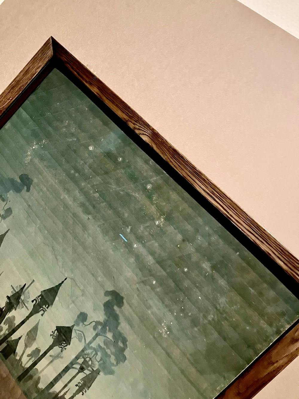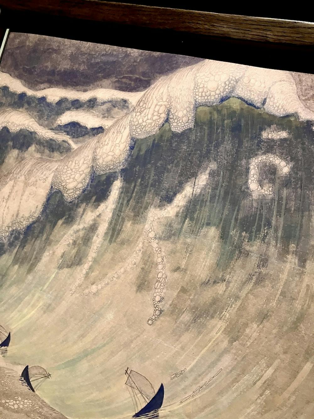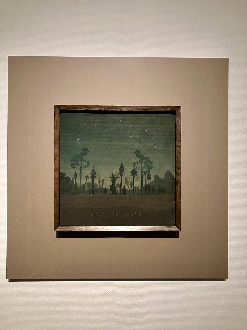 私がチュルリョーニスの作品がとても好きな理由は、象徴的でフィクション性が高く、細部のディテールが細かい点です。寄りの写真をいくつか載せていますが、実は背景でうっすら描かれている建物が別の作品でメインで描かれていたり、あっちの天使とこっちの天使のデザインが一緒、みたいなことが多々あるんです。