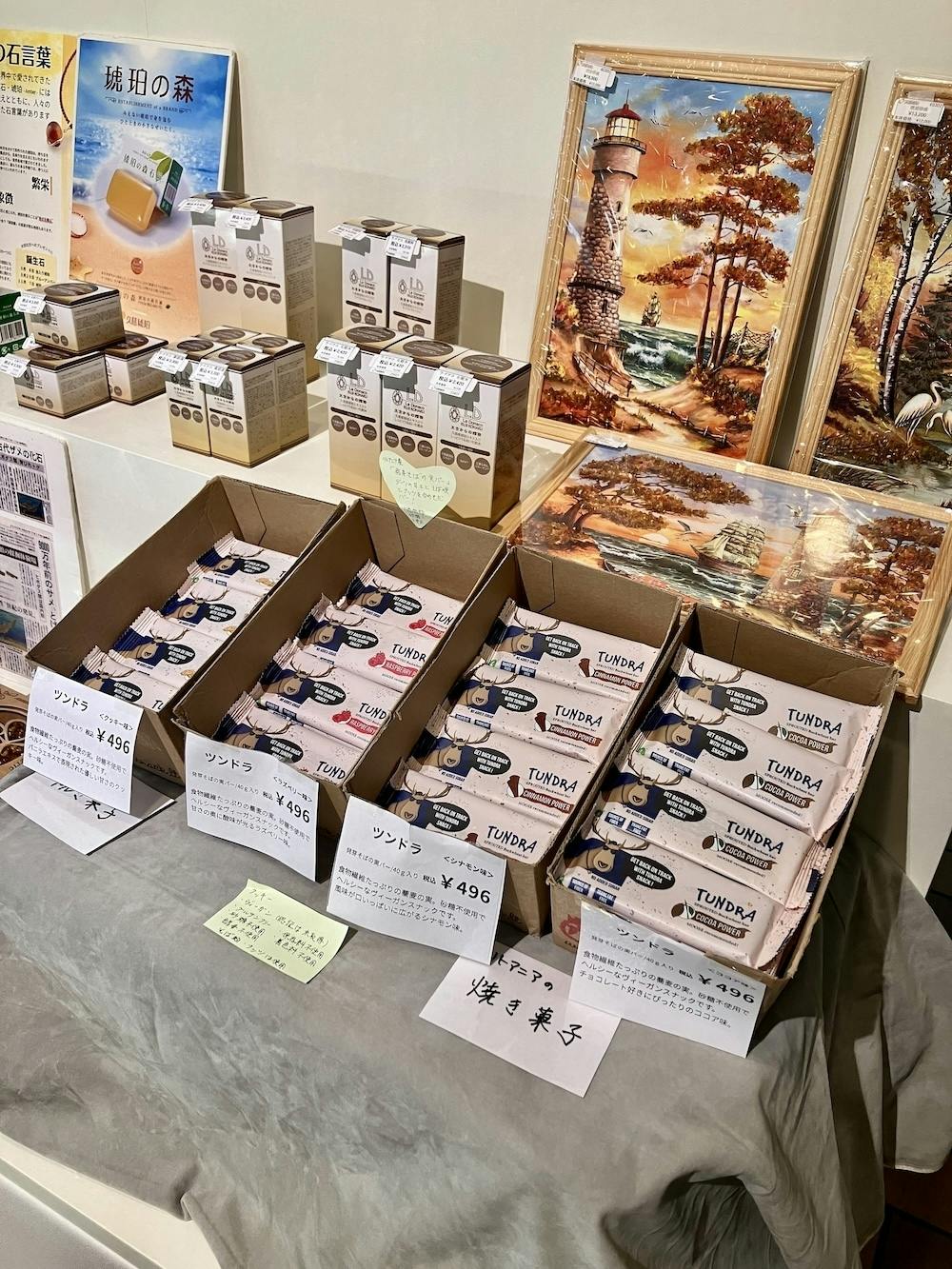 グッズも充実していて、当店の商品「そばの実バー」4種類も販売中!初週で結構売れたようで嬉しいです。お酒のミニチュアボトルも現在は販売中(この日は酒類販売の手続き中で販売前でした)。リトアニア国家遺産の蜂蜜のお酒たちをぜひ。
