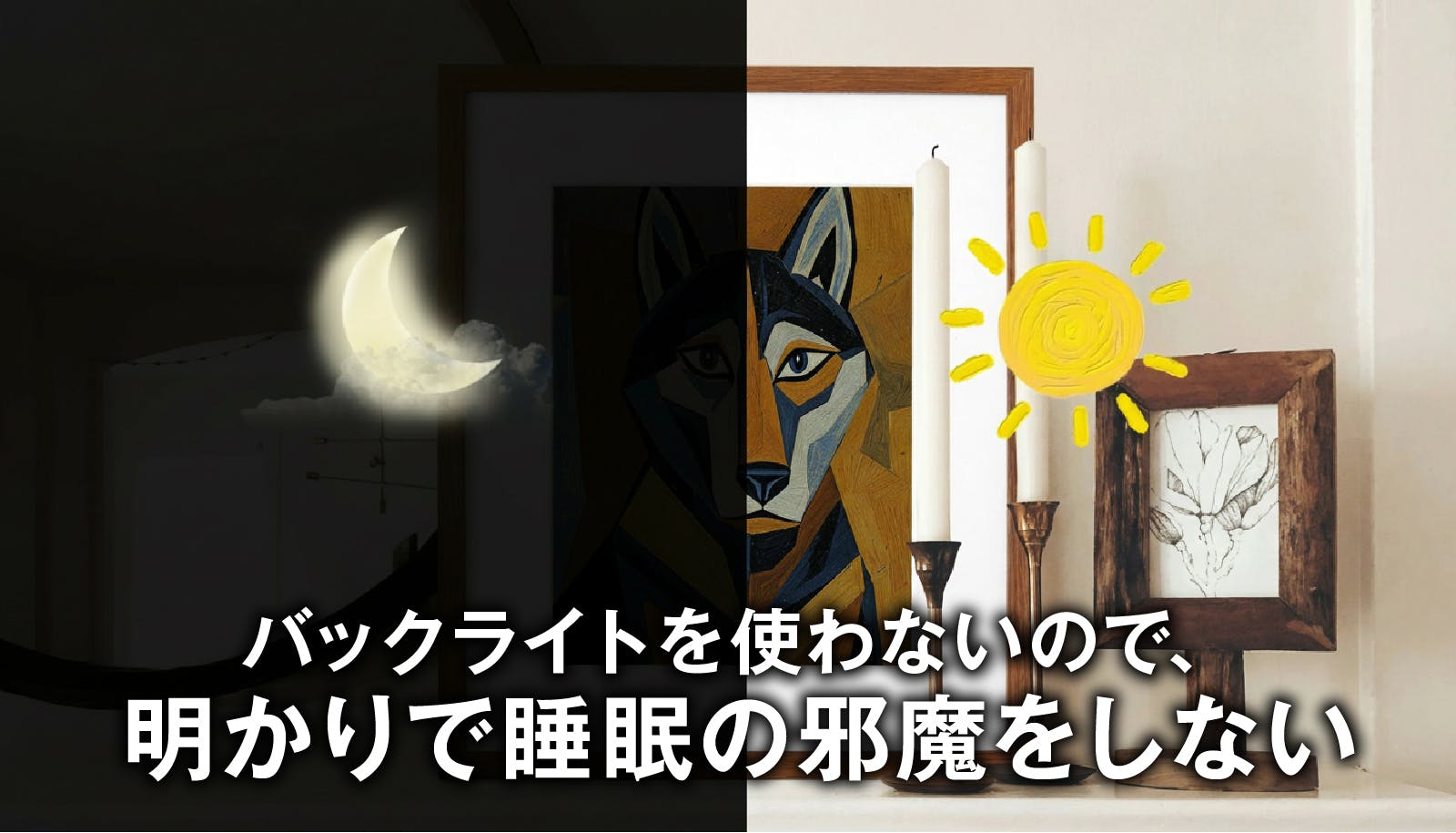 バックライトを使用せず、表示される絵画の見た目の質感は紙に描いた絵画やポスターそのまま。