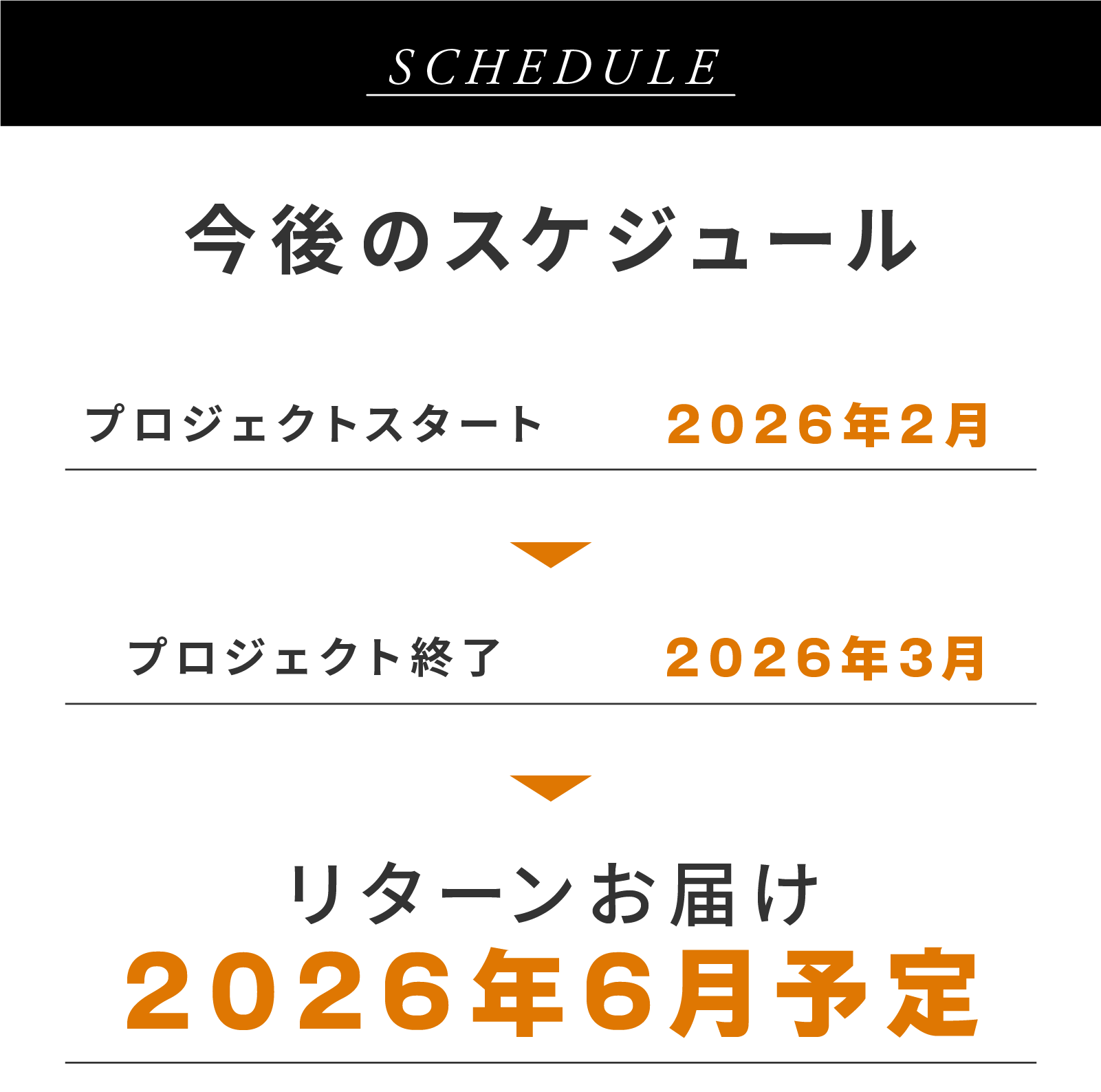 ※本文中に記載させていただいたスケジュールは、あくまでプロジェクト公開時点の予定です。クラウドファンディングの性質上、配送遅延のおそれがございます。以上の注意点につきましてあらかじめご理解とご了承いただいた上でご支援くださいますよう、よろしくお願い申し上げます。
