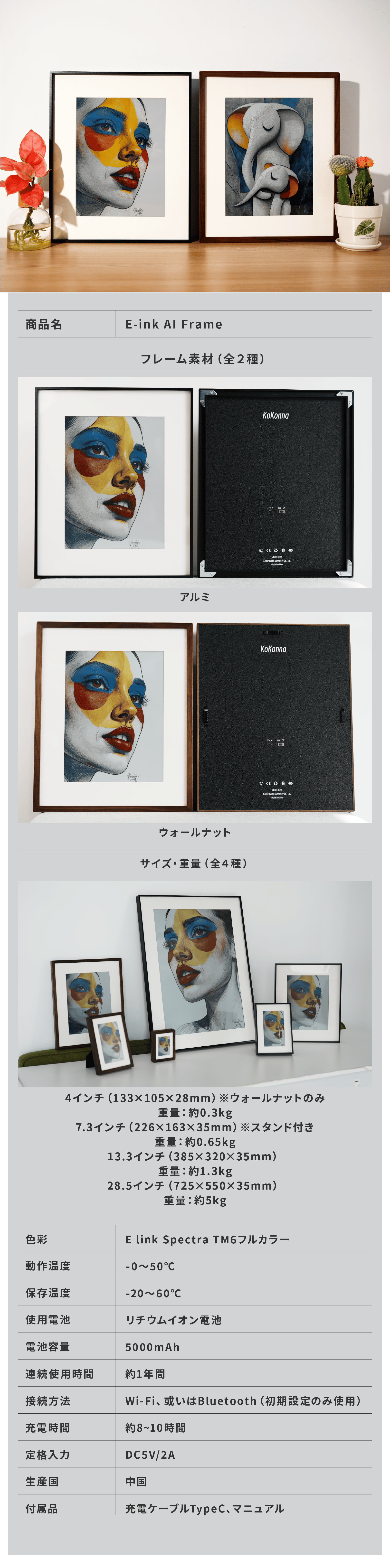 コードレスで壁に飾って楽しめる、電子インク式のデジタルアートフレームです。