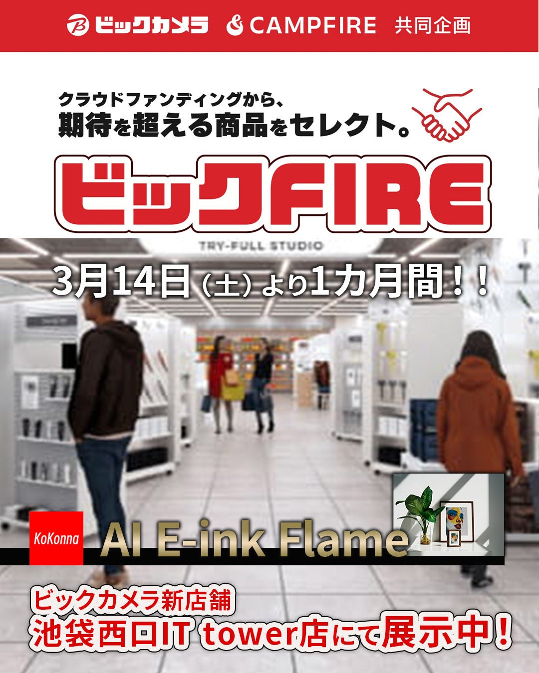 いつも本プロジェクトにご関心・ご支援をいただき、誠にありがとうございます。このたび、先週オープンしたビックカメラの新店舗「ビックカメラ池袋西口IT tower店」にて、AI E-ink Frame “Kokonna” の展示がスタートしました。本店舗では、“未来の商品”に触れることでワクワクする体験を提供する展示スペースが設けられており、その中でKokonnaをご紹介いただいています。展示は約1ヶ月間を予定しており、紙のような質感を再現する電子インクディスプレイや、AIによるアート生成の魅力を実際の製品でご体験いただけます。▼詳しくはこちらhttps://www.biccamera.com/bc/i/shop/shoplist/shop133.jsp■ 展示場所ビックカメラ池袋西口IT tower店3階(連携企業スペース)■ 店舗情報住所:〒171-0021東京都豊島区西池袋3-28-13営業時間:10:00~21:00池袋駅C4出口直結。JR各線(山手線・埼京線・湘南新宿ライン)、東京メトロ各線(丸ノ内線・有楽町線・副都心線)、東武東上線、西武池袋線など8路線から地下通路でアクセス可能です。雨の日でも濡れずにお越しいただけます。お近くにお越しの際は、ぜひ店頭でAI E-ink Frame “Kokonna” の質感や表示をご覧いただければ幸いです。引き続きどうぞよろしくお願いいたします。
