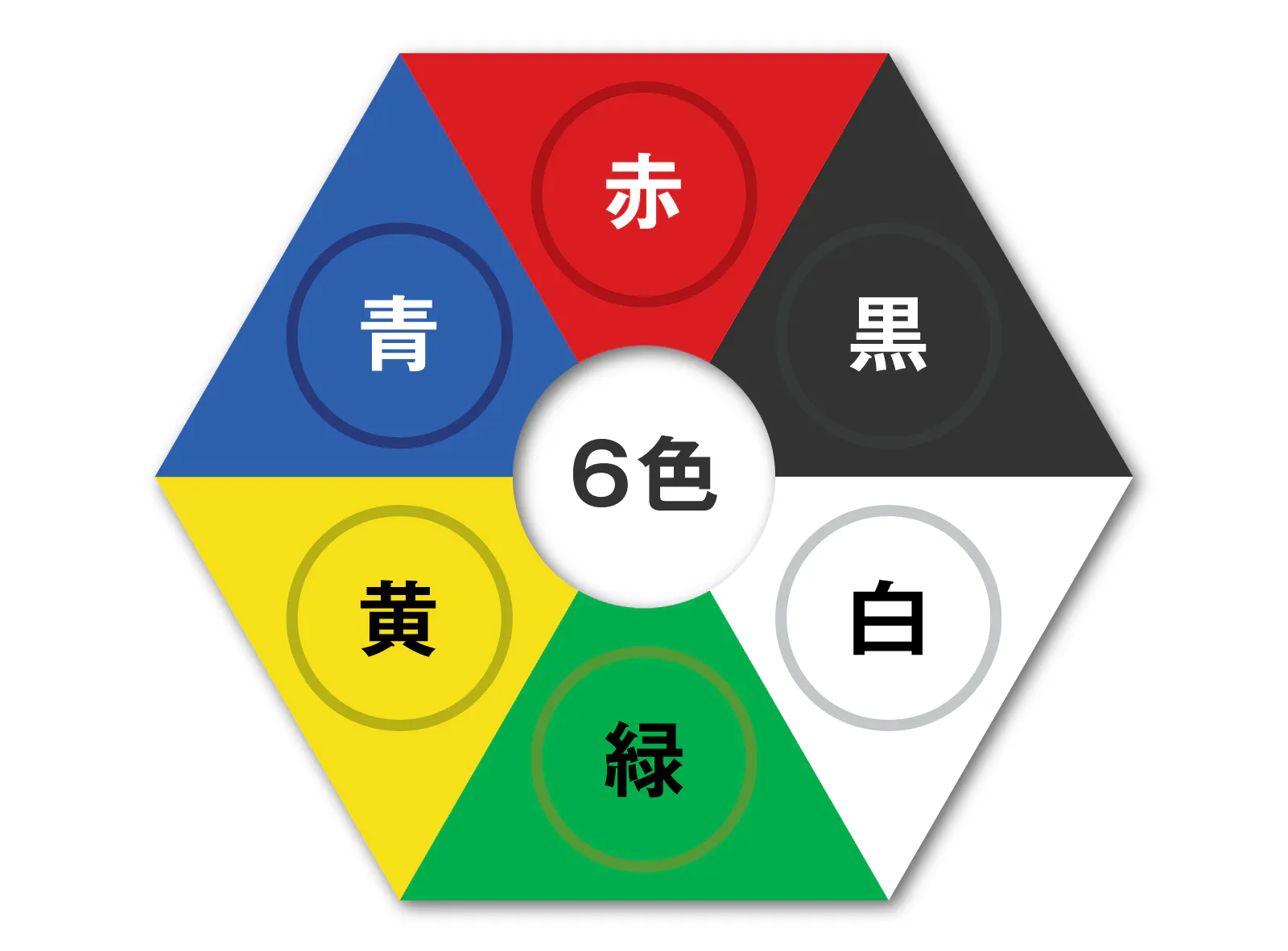 「赤」「青」「黄色」「緑」「白」「黒」の6色を再現。