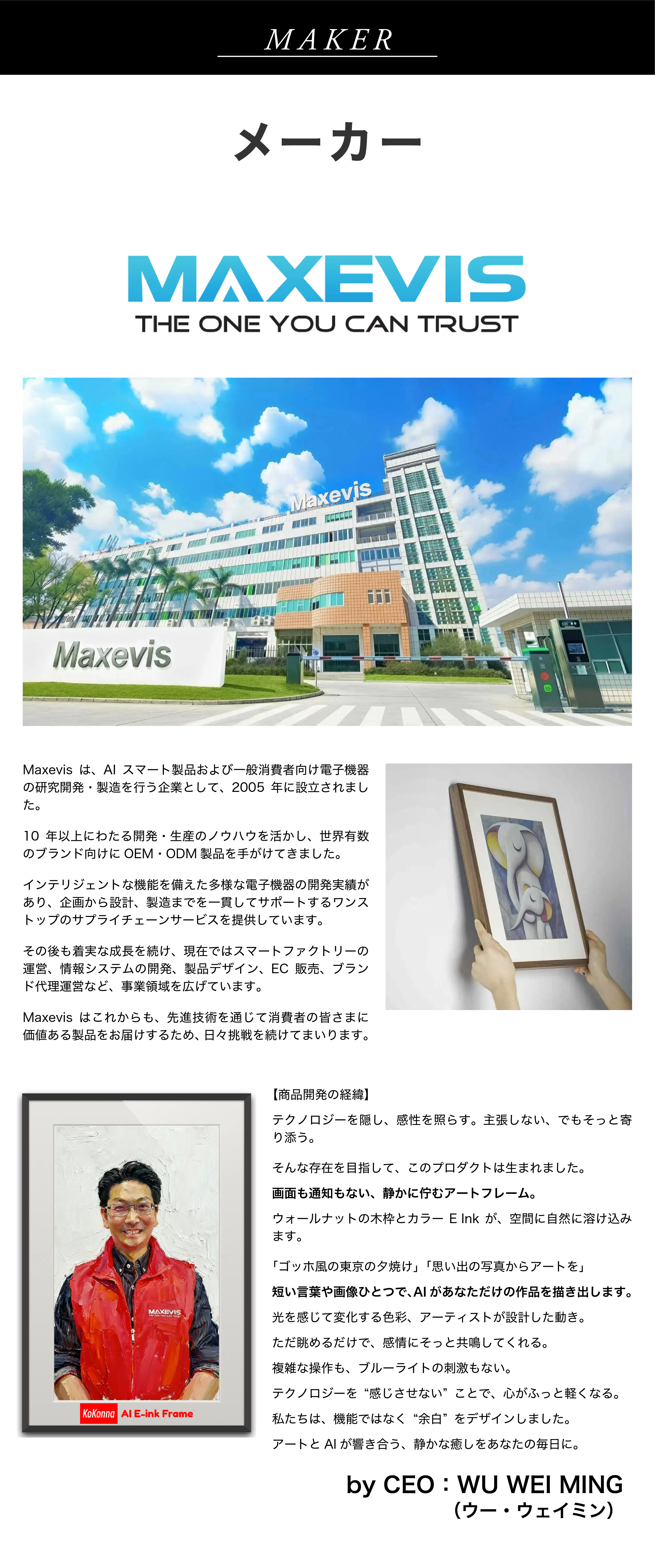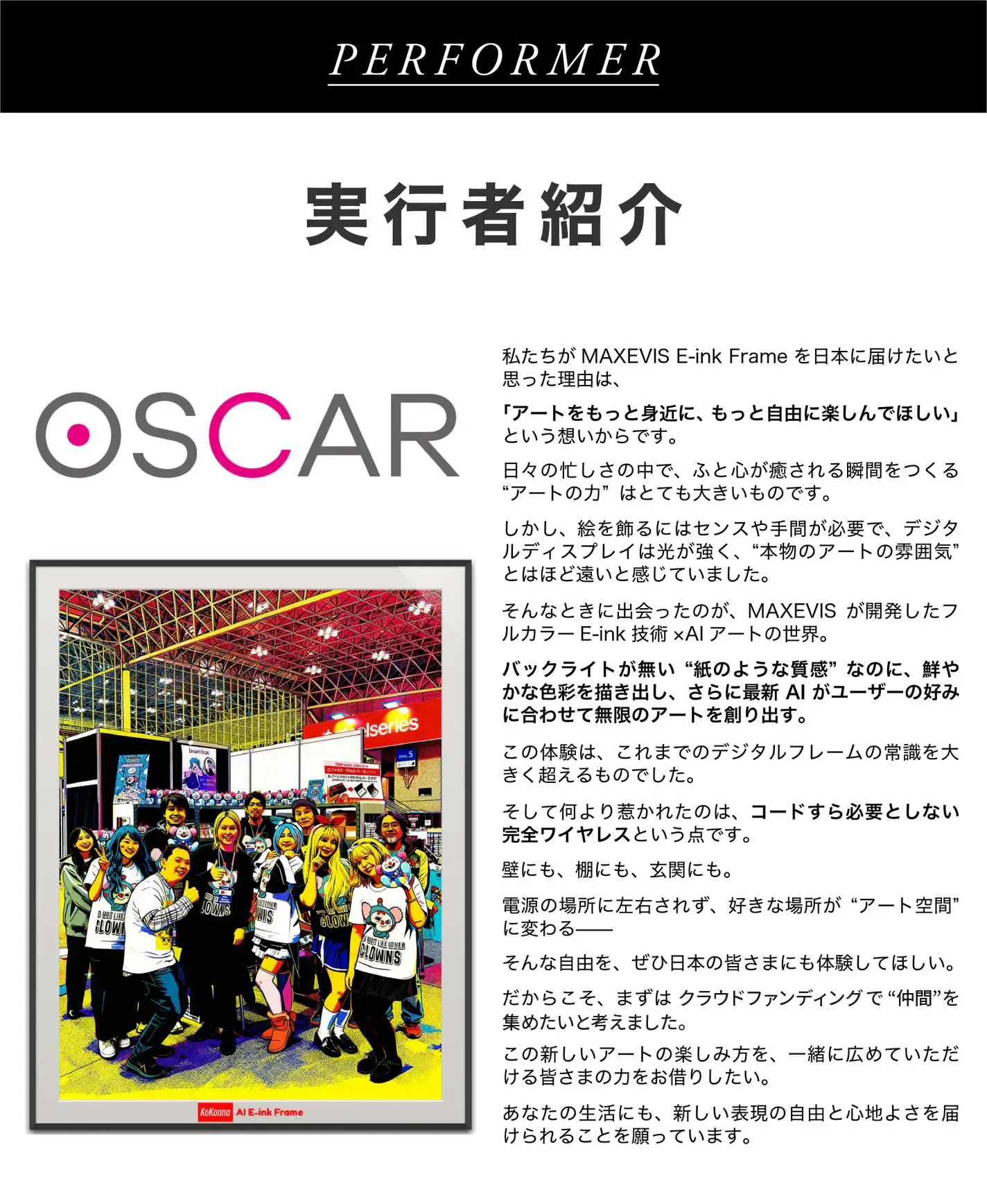 ※リターン品の配送が完了するまで、オスカージャパン株式会社は MAXEVIS "AI E-ink Frame kokonna" の日本における独占販売権を有する正規代理店です。