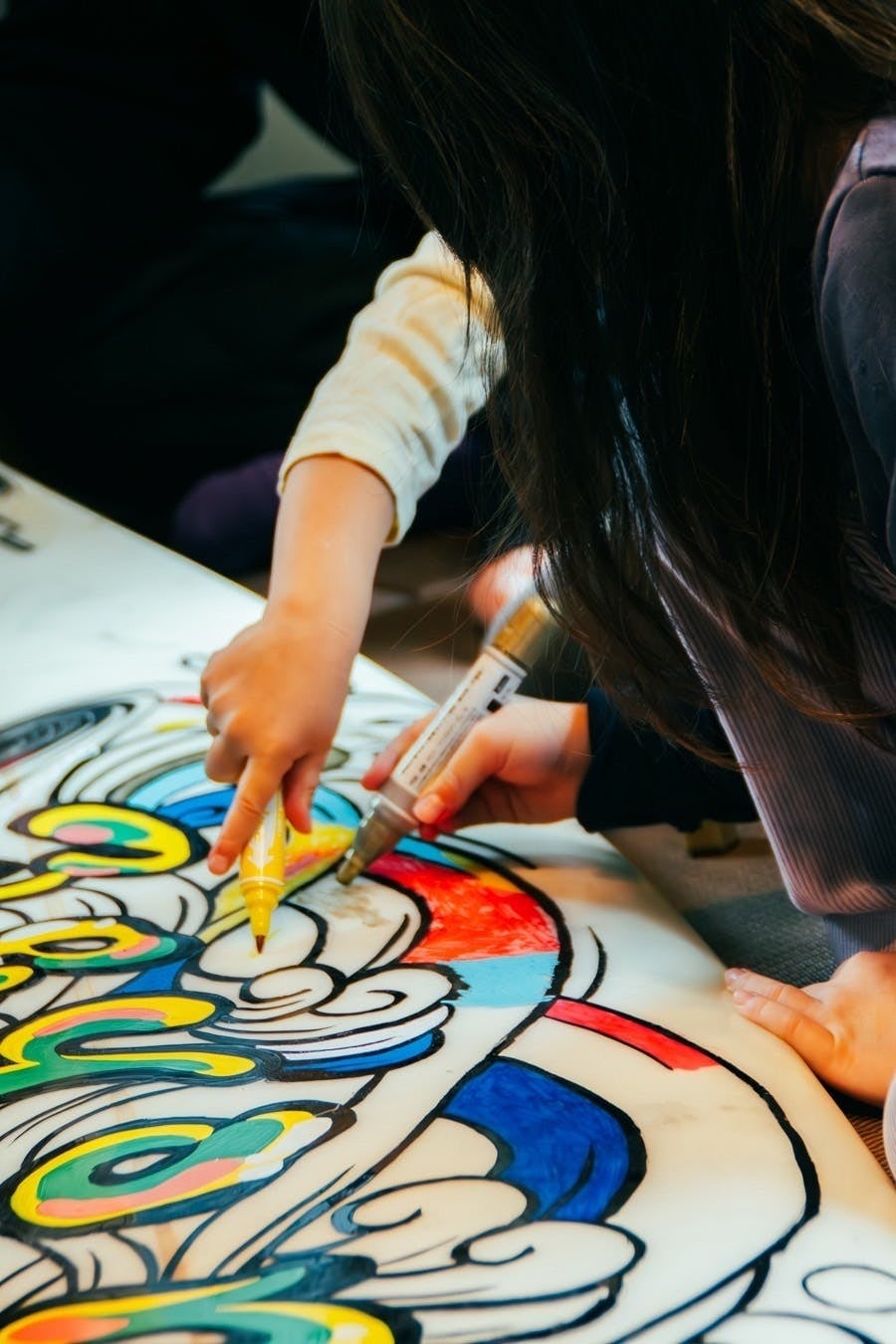 これは、みんなでサーフボードに落書きをするアート制作の様子です。海に近い地域ならではの活動を大切にしています。