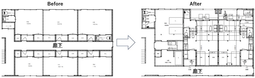 施設は平成初期に建て替えられ、長期滞在の工事関係者向けに整備された「シンプルで必要最低限の設備」の構成でした。 壁は薄く、部屋にトイレ・シャワー設備等のない部屋の作りで窓からの眺望に配慮がない作りで、鳥海山を楽しみにして来られるお客様からは、「もっと鳥海山が良く見えれば」、「里山の雰囲気を感じたい」、「自然を感じたい」、「静かに滞在したい」、「プライベートな時間を大切にしたい」という声が多く、老朽化したお風呂についても「せっかく旅行にきたのだから特別な雰囲気を味わいたい」という設備に対するご要望、苦言をいただいておりました。そうした声が年々増えています。