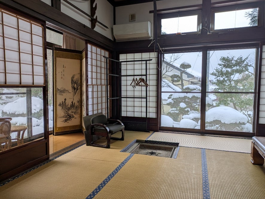 <現在の囲炉裏部屋 古い建物に近代的な設備を整備>