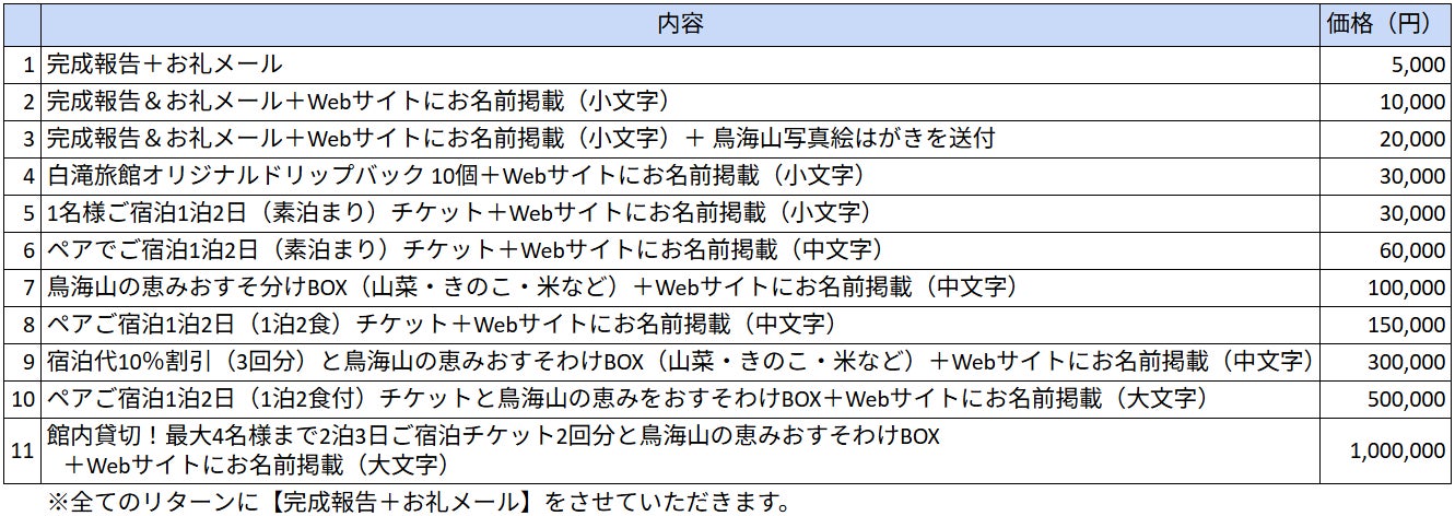ご支援いただいた方のお名前を掲載させていただくもの、実際にご宿泊いただくもの、地域をご案内させていただくもの、鳥海山の恵みが届くものなどをご用意させていただきました。