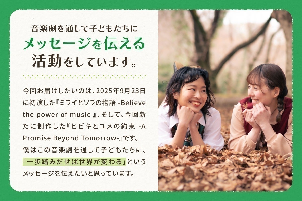 終演後も特別体験!親子プレミア席+限定ミニコンサート 前方チケット(大人1枚、子供1枚・会場特典(終演後ミニコンサート チケットについて ・日時場所:リターンの種類からご希望の公演場所をご選択ください 7/18 名古屋 16時開場 17時開演 8/22 高松 13時開場 14時開演 9/5東京 13時開場14時開演 9/22福岡 13時開場14時開演 ・プレミア席は前列2席です! ・支援者様の交通費や滞在費は各自でご負担ください。 ・支援者様との連絡方法:詳細はメールで連絡します。 ・「子供チケット」は12歳まで(小学生まで) 終演後ミニコンサート 終演後下記の時間より役を演じてくれた皆さんの歌と 飯野のオリジナル楽曲の大編成ver.の30分ほどのミニコンサートをお楽しみいただけます! 7/18 名古屋 18時半開演19時終演 8/22 高松 15時半開演16時終演 9/5東京 15時半開演16時終演 9/22福岡 15時半開演16時終演