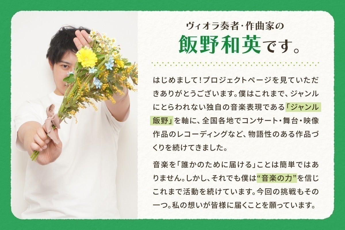 1日まるごと特別体験|親子VIP プランリハ・終演後・限定データ付き 前方チケット(大人1枚、子供1枚・会場特典(リハーサル・終演後ミニコンサート・ミニコンサートデータ) チケットについて ・日時場所:リターンの種類からご希望の公演場所をご選択ください 7/18 名古屋 16時開場 17時開演 8/22 高松 13時開場 14時開演 9/5東京 13時開場14時開演 9/22福岡 13時開場14時開演 ・プレミア席は前列2席です! ・支援者様の交通費や滞在費は各自でご負担ください。 ・支援者様との連絡方法:詳細はメールで連絡します。 ・「子供チケット」は12歳まで(小学生まで) 直前リハーサルについて 下記の時間より入れます。それ以降会場のお席でゆっくりお待ちいただけます。 7/18 名古屋 14時リハーサル開始 8/22 高松 11時リハーサル開始 9/5東京 11時リハーサル開始 9/22福岡 11時リハーサル開始 ・支援者様との連絡方法:詳細はメールで連絡します。 終演後ミニコンサート 終演後下記の時間より役を演じてくれた皆さんの歌と 飯野のオリジナル楽曲の大編成ver.の30分ほどのミニコンサートをお楽しみいただけます! 7/18 名古屋 18時半開演19時終演 8/22 高松 15時半開演16時終演 9/5東京 15時半開演16時終演 9/22福岡 15時半開演16時終演 終演後ミニコンサート ・終演後の30分後よりスタートします! ・役を演じてくれた皆さんの歌と飯野のオリジナル楽曲の大編成ver.の30分ほどのミニコンサートです。 ミニコンサート動画 ・収録時間:30分ほど ・提供方法:メールにURLを記載します。