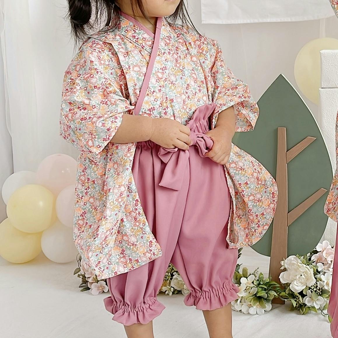 パンツ生地は和柄、リバティ共通でくすみピンクです。