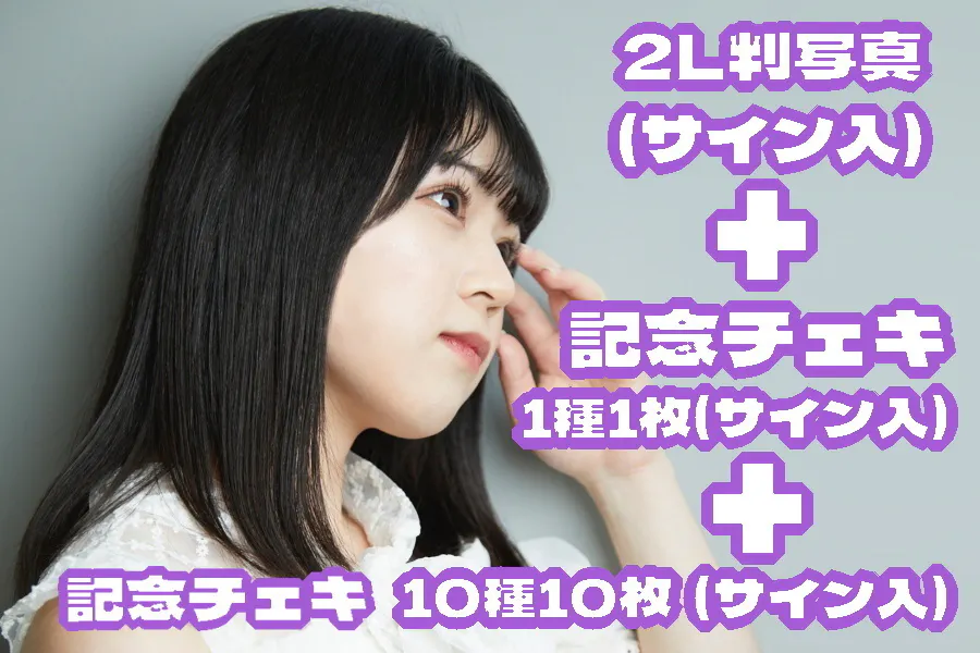 2)の写真(2L判)+ 3)のソロチェキ1種類(A)+ 10)のソロチェキ10種類(B~K)の3点セットです