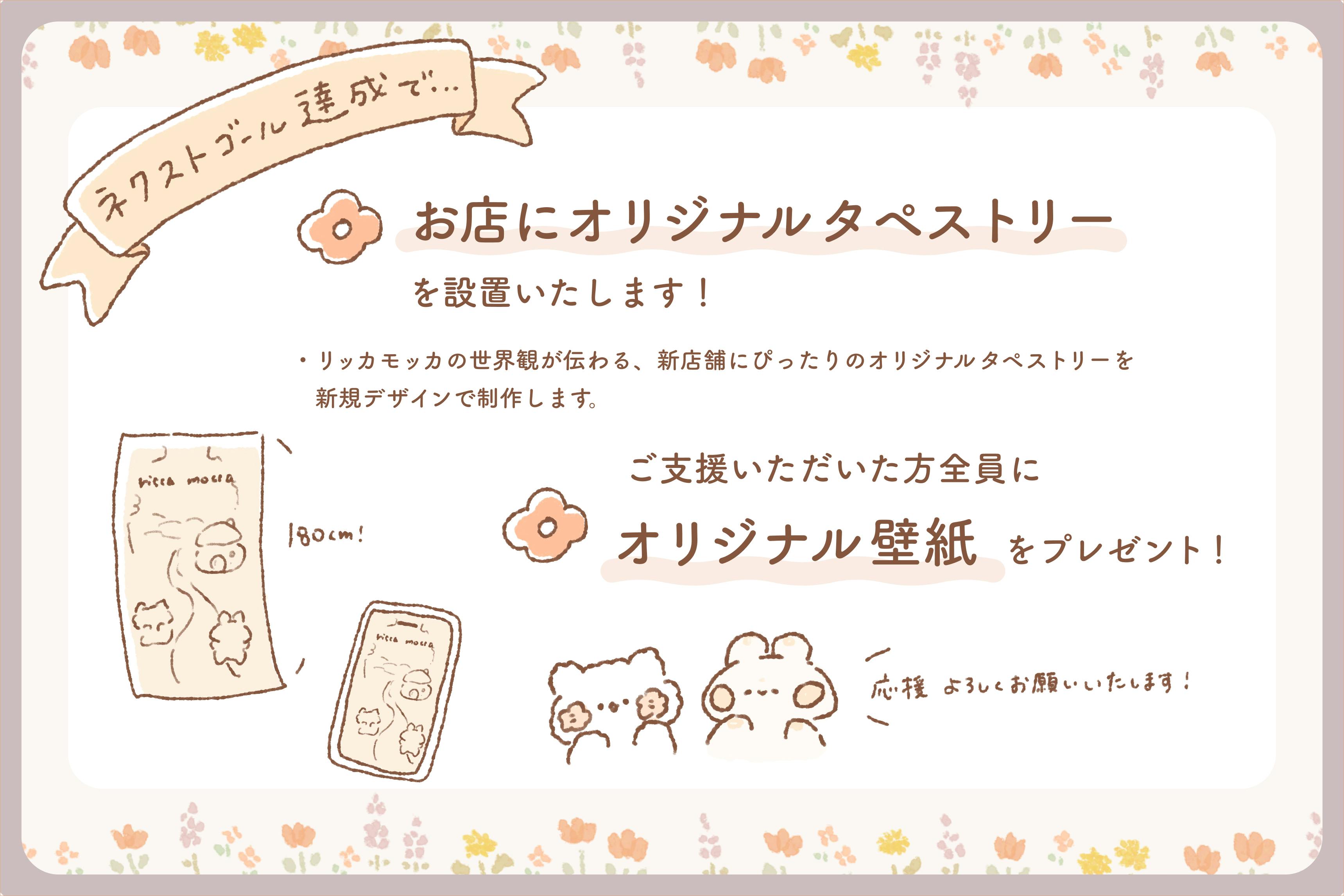 お店の扉を開けた瞬間からリッカモッカの世界観が伝わる、新店舗にぴったりのオリジナルタペストリーを新規デザインで制作します。