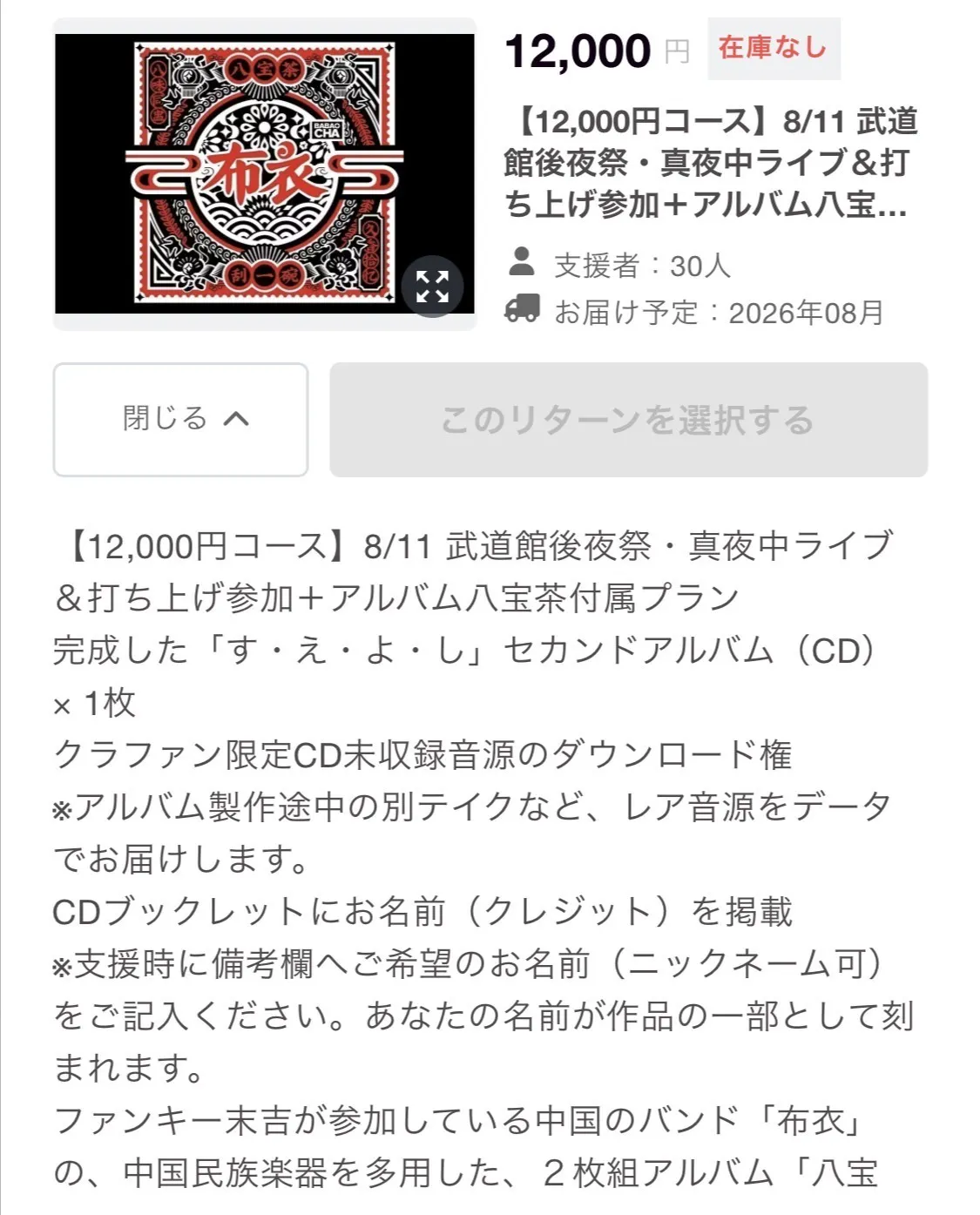 このライブは当日券を発売したりする計画は今のところありません。基本このファンディングの支援者のみと考えておりますが、更なる参加希望の方がおられましたらリターンを追加するしかありません。リターンは同じ内容では追加出来ず、何かを加えてまた値段が上がるリターンとなってしまうので考えものです。