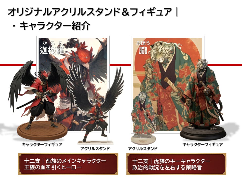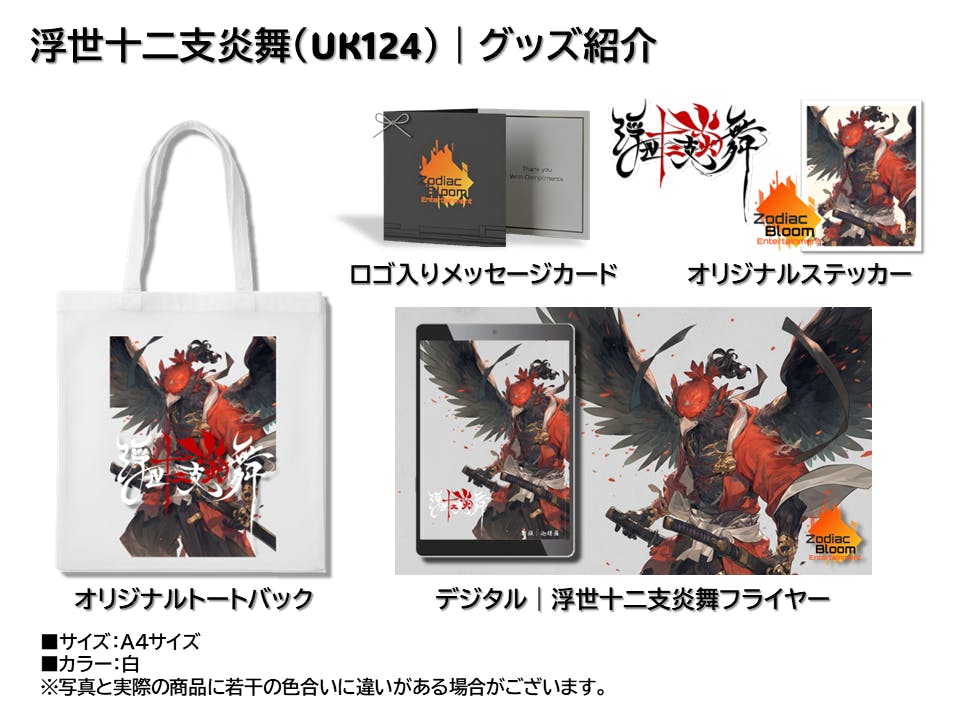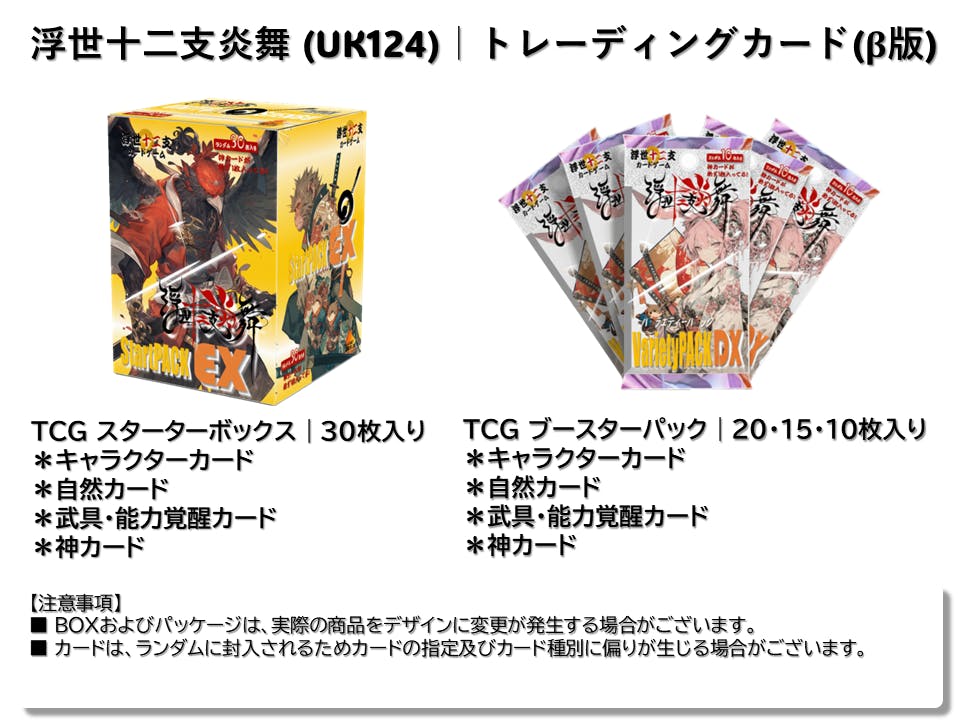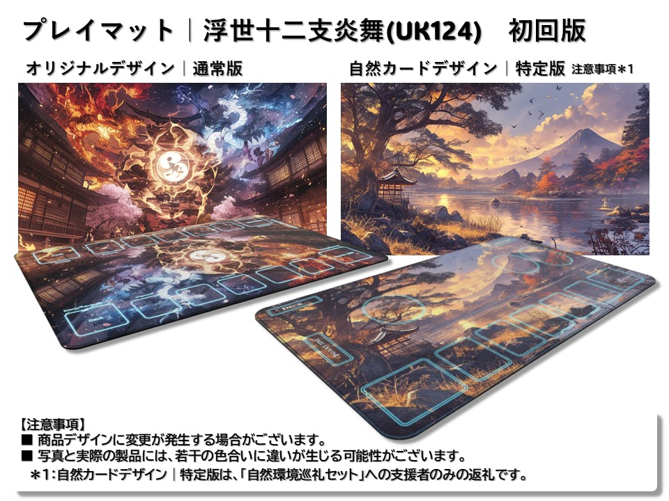 *支援いただいた方には、以下オリジナルを提供します。 ■【参詣】浮世十二支炎舞(UK124)自然環境巡礼セット ①オリジナルロゴ入りメッセージカード:1通 ※カードサイズ:はがきサイズ ※ZB-Entertainment|浮世十二支炎舞(UK124) ②オリジナルステッカー|浮世十二支炎舞ロゴ:1枚/ZB Entertainment ロゴ:1枚 /キャラクターステッカー:1枚 ※ステッカーサイズ:3cm×5cm (あくまでサンプルサイズにて実際と多少の変更がある場合はご容赦くださいませ) ③壁紙(デジタル)|浮世十二支炎舞(UK124)オリジナルデザイン ※データサイズ:横型「16:9」サイズ ④スターターボックス:30枚入 (キャラクターカード・自然カード・武具/能力開発カード・神カード) ※ゲームカードサイズ:66mm×88mm (あくまで初回ベータ版にて実際と多少の変更がある場合はご容赦くださいませ) ⑤カードゲームルールブック(デジタル):1冊 ※データサイズ:B5版‐縦型サイズ ⑥プレイマット|オリジナル自然環境デザイン ※マットサイズ:横型「約30cm×60cm」 ⑦ブースターパック:15枚入 ※ゲームカードサイズ:66mm×88mm (あくまで初回ベータ版にて実際と多少の変更がある場合はご容赦くださいませ) ⑧鳥族|メインキャラクターアクリルスタンド:1体 ※サイズ:高さ約8cm (あくまでサンプルサイズにて実際と多少の変更がある場合はご容赦くださいませ) ⑨虎族|メインキャラクターアクリルスタンド:1体 ※サイズ:高さ約8cm (あくまでサンプルサイズにて実際と多少の変更がある場合はご容赦くださいませ) ⑩浮世十二支炎舞(UK124)|オリジナルトートバック:1つ ※サイズ:縦型A4サイズ