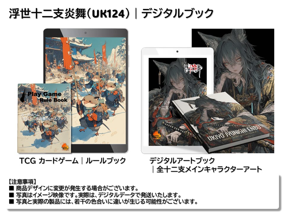 *支援いただいた方には、以下オリジナルを提供します。 ■【入門】浮世十二支炎舞(UK124)のはじまりセット ①オリジナルロゴ入りメッセージカード:1通 ※カードサイズ:はがきサイズ ※ZB-Entertainment|浮世十二支炎舞(UK124) ②オリジナルステッカー|浮世十二支炎舞ロゴ:1枚/ZB Entertainment ロゴ:1枚 /キャラクターステッカー:1枚 ※ステッカーサイズ:3cm×5cm (あくまでサンプルサイズにて実際と多少の変更がある場合はご容赦くださいませ) ③壁紙(デジタル)|浮世十二支炎舞(UK124)オリジナルデザイン ※データサイズ:横型「16:9」サイズ ④スターターボックス:30枚入 (キャラクターカード・自然カード・武具/能力開発カード・神カード) ※ゲームカードサイズ:66mm×88mm (あくまで初回ベータ版にて実際と多少の変更がある場合はご容赦くださいませ) ⑤カードゲームルールブック(デジタル):1冊 ※データサイズ:B5版‐縦型サイズ ⑥プレイマット|初回版:1枚 ※マットサイズ:横型「約30cm×60cm」