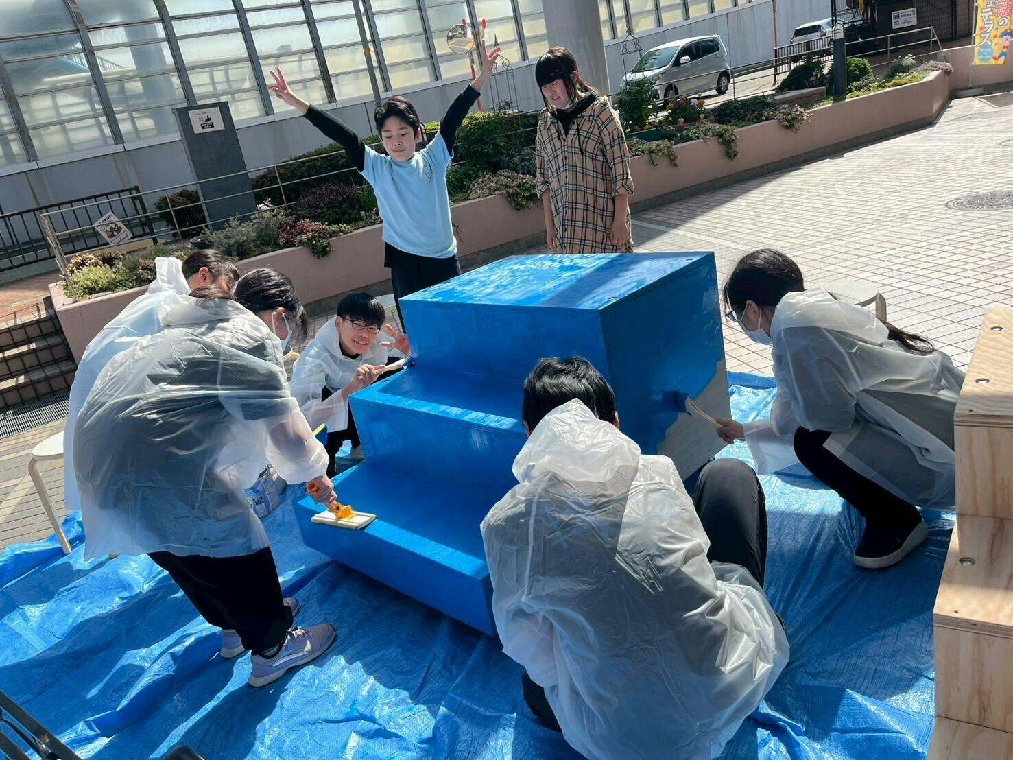 2026/03/02 22:04これまでベニヤ板のままでのセットで稽古をしておりましたが、ようやく色のイメージがつき、3月1日、みんなで色塗りをしました。タイル汚しちゃだめ!絵の具踏んだ靴で移動したらあかん!!!!わ〜、髪の毛メッシュなった〜wなどなど、きゃっきゃ言いながらみんなの手がべっとりペンに塗れで、楽しい時間になりました。もちろん、水性ペンキで安心。・・・私としましては、もう少し・・・空色に、みんなの手形でできた虹が浮かんだような色合いになる想定でしたが・・・・・・・・出来具合は、当日を楽しみにしてくださいね。セットの色塗りに加えて、この日は朔参りにも行きました。稽古の時間はとても大切ですが、やはりもっと大切のものも忘れないで伝えたいと思います。今週は照明合わせがあります。完成に近い状態。ますます、頑張らないといけなのでした。引き続き応援よろしくお願いいたします。 もっと見るうさちゃんへインタビュー