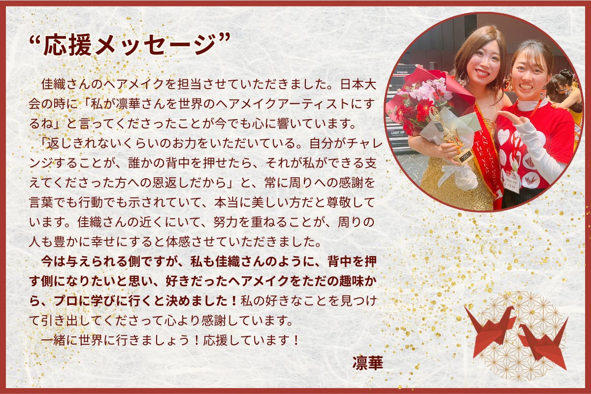 ・直筆のお手紙を送ります(一人ひとりに、心を込めて感謝の言葉を綴ります)・世界大会当日の動画・写真付き報告メールを送ります (パフォーマンスやスピーチを収めた、支援者様限定の報告です)
