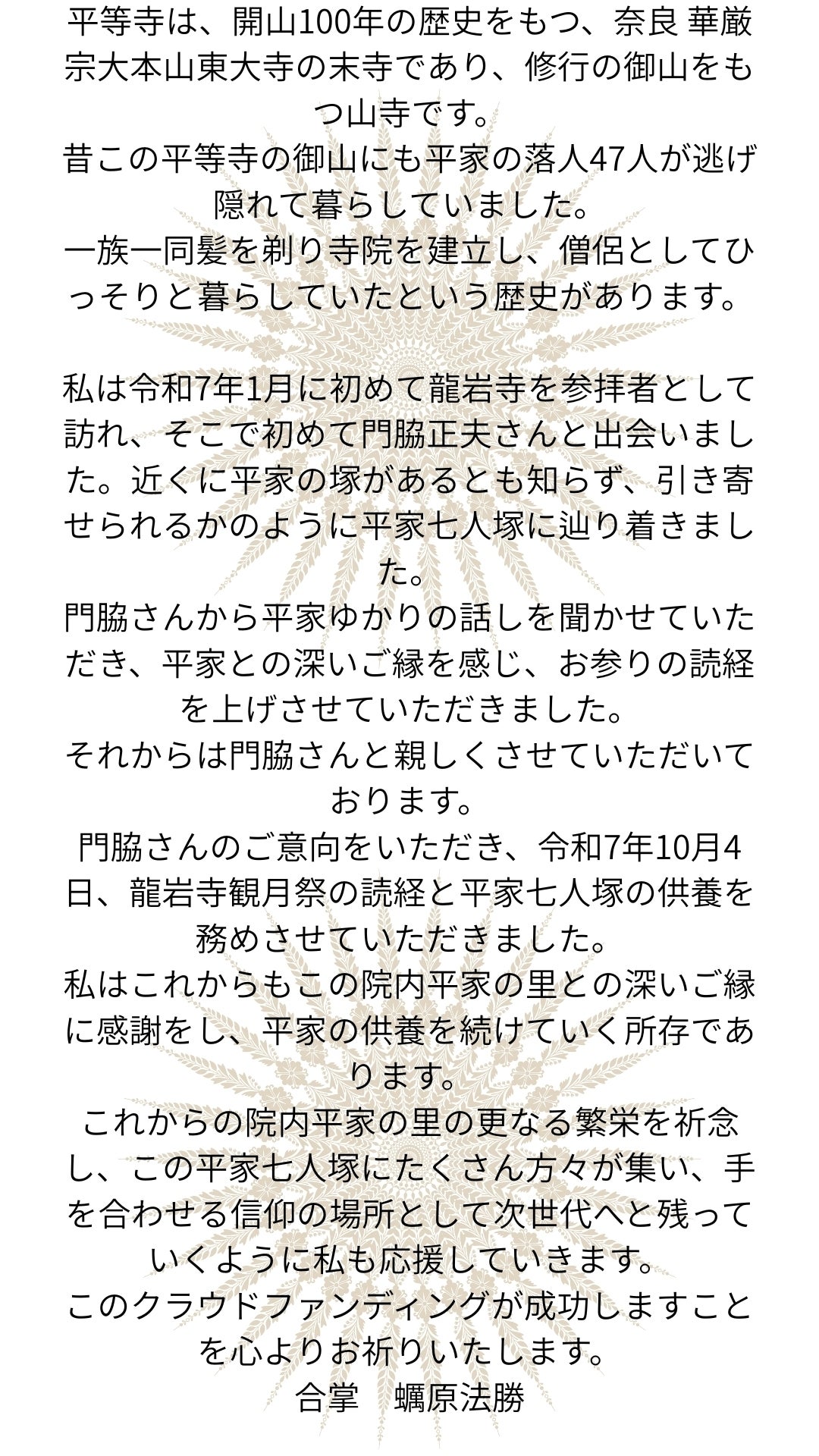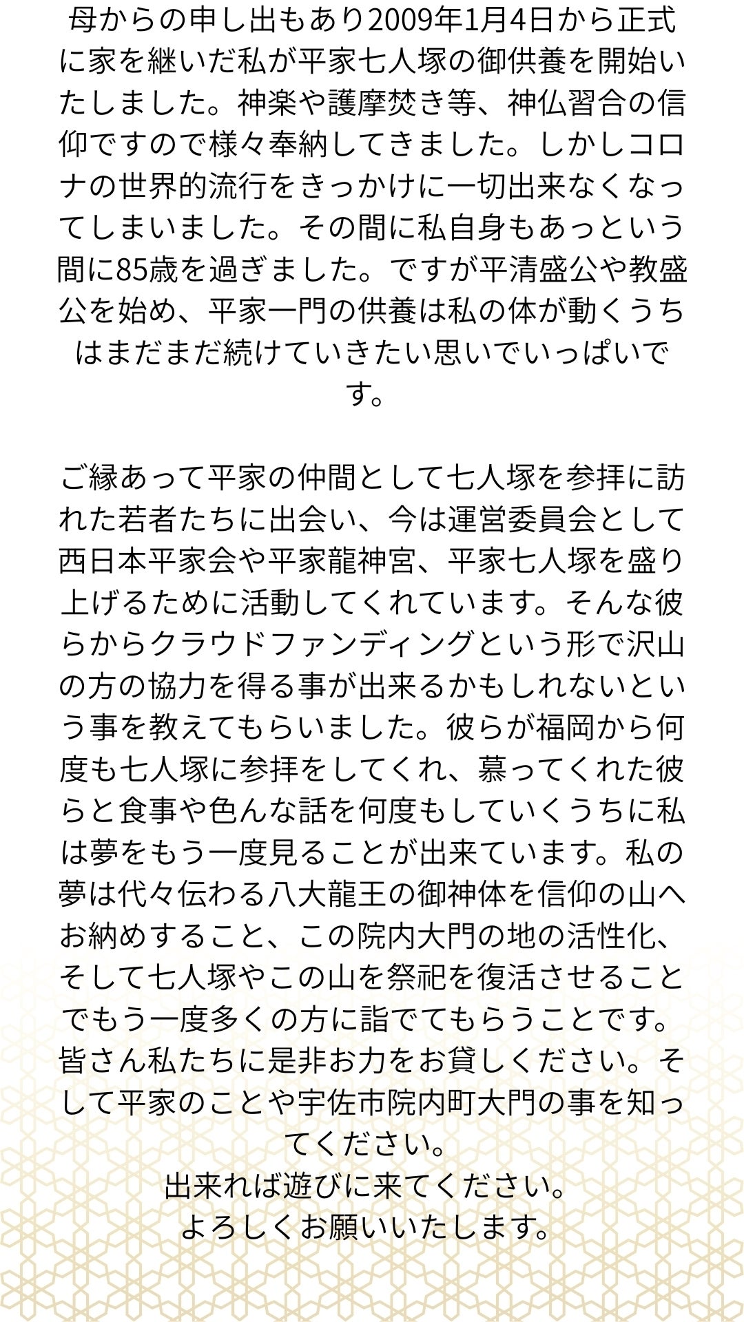 平家まつりの費用と平家七人塚周辺の整備費用を募ります。