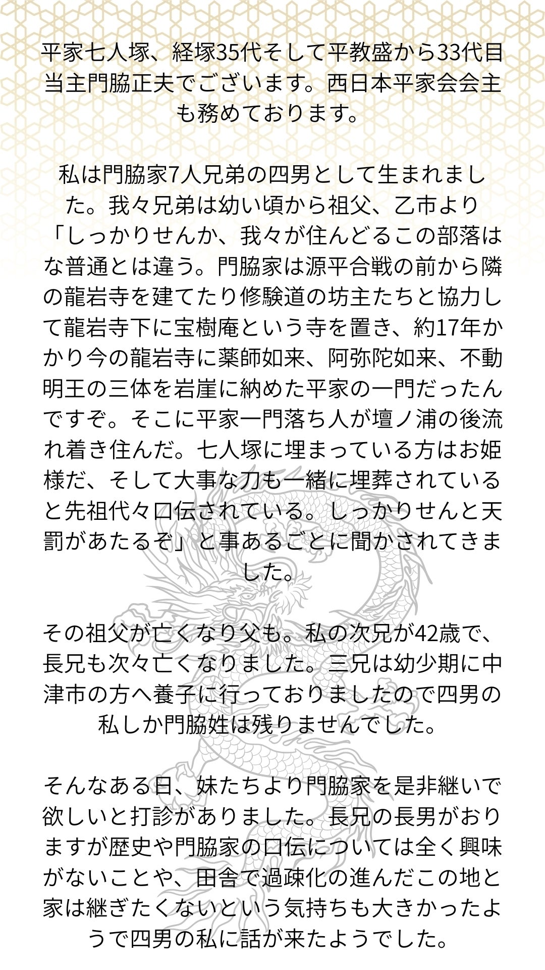 平清盛公の弟であり、大河ドラマ「鎌倉殿の13人」の登場人物である「平教盛公」の子孫である門脇正夫さんが会主となり、平家の子孫や平家にゆかりのある人々で形成されております。