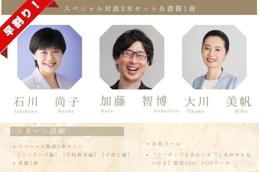 ①コーチングを生かした「しあわせを見つける質問100」という資料をご提供します。