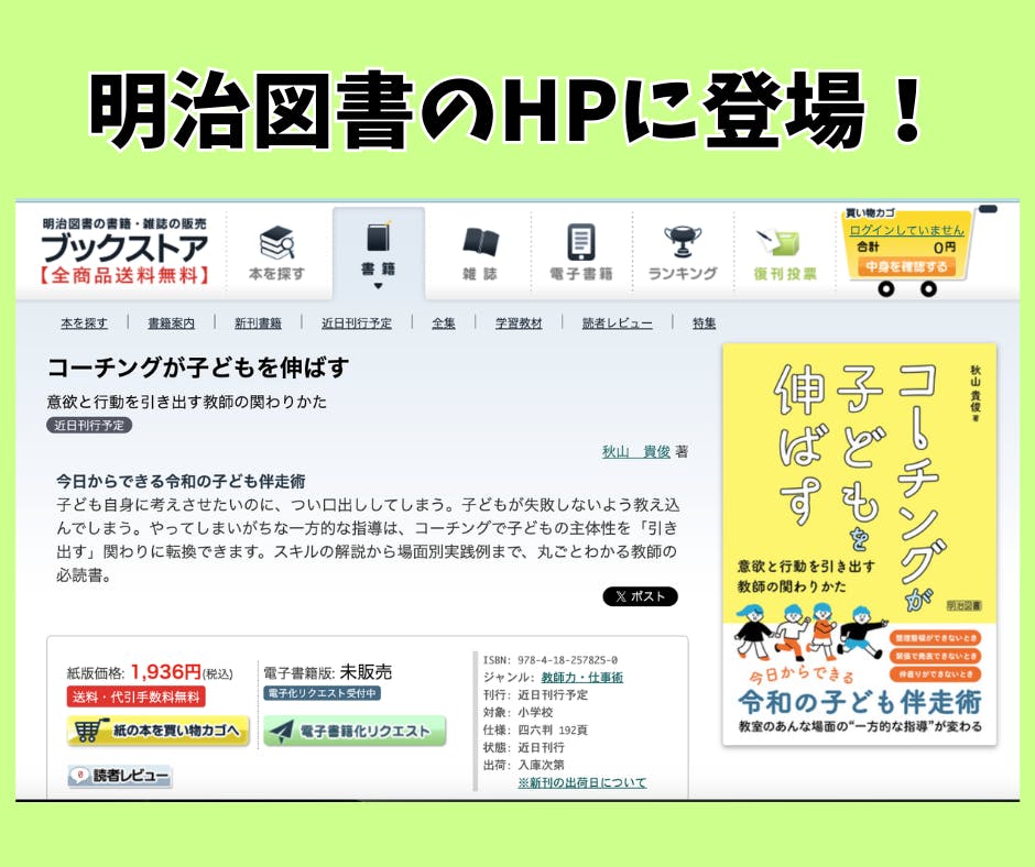 2026/02/18 21:56明治図書のHPに登場しました!明治図書のHPに『コーチングが子どもを伸ばす』が登場しました。実は、今まで原稿を書いたり、表紙のデザインをみたりしても、心のどこかで「本当に出版されるのかな?」「やっぱり出版は取りやめますと言われるかも」と不安な部分がありました。まさか、自分が出版なんてできないよね。なんて、心の奥で思っていました。クラウドファンディングの準備をしつつ、心のどこかで出版への不安が消えませんでした。応援してもらっているのに、出版が中止になったら、どうしよう。。。なんて思っていました。しかし、今日 明治図書のホームページに載った『コーチングが子どもを伸ばす』みて、本当に本になるんだ!と実感できました。おそらく夢ではないはずです。よかったら↓ご確認ください。https://www.meijitosho.co.jp/detail/4-18-257825-0そして、ご支援が40%を超えました!本当に、本当に、ありがとうございます! もっと見る