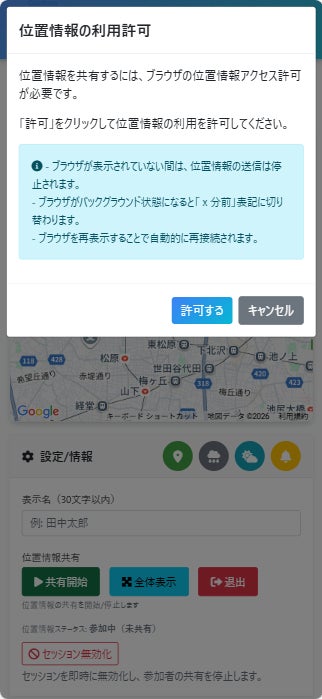 ・プライバシー重視:ブラウザを閉じれば送信停止。設定時間が過ぎると自動で共有を終了します。