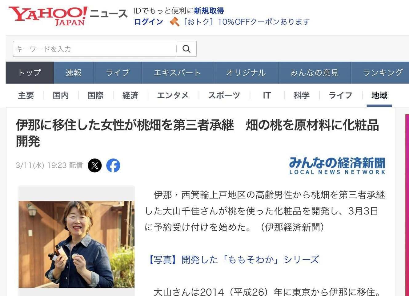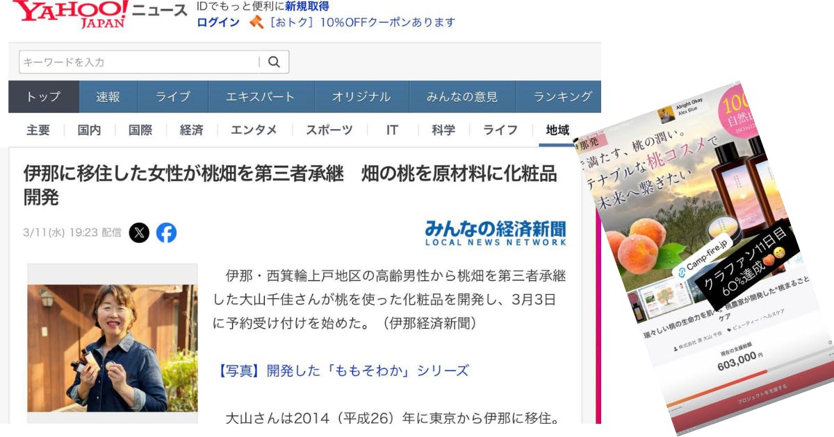 2026/03/12 21:09桃畑から生まれたこの取り組みを、伊那経済新聞さんに取材していただき、Yahooニュースにも掲載していただきました。桃の実だけでなく、種・枝・葉まで活かす「桃まるごとコスメ」。桃畑で感じてきた循環を、こうして記事として届けていただけたこと、とても嬉しく思っています。応援してくださっている皆さま、本当にありがとうございます。正直、まさかYahooニュースに掲載していただけるとは思ってもいませんでした。そして昨晩、クラウドファンディングの支援金も555,500円に。桃の神さまにも「Go Go」と背中を押してもらっているようで、とてもありがたい気持ちです。よかったら記事もご覧ください。(記事はこちら)https://news.yahoo.co.jp/articles/27525f656426f2714687efe61fb2caf62c0c6983もしよろしければ、この取り組みを周りの方にもシェアしていただけたら嬉しいです。 もっと見る
