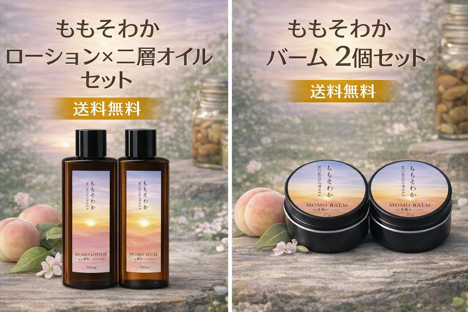 「ももそわか スキンケア3点セット」を中心に、世界が認めたジャムや、若桃のシロップ煮などを組み合わせた特別なセットをご用意しました。 桃・粗製糖・レモン果汁など、シンプルな素材で仕上げた畑の恵みを、ぜひ日々の暮らしの中で味わってください。