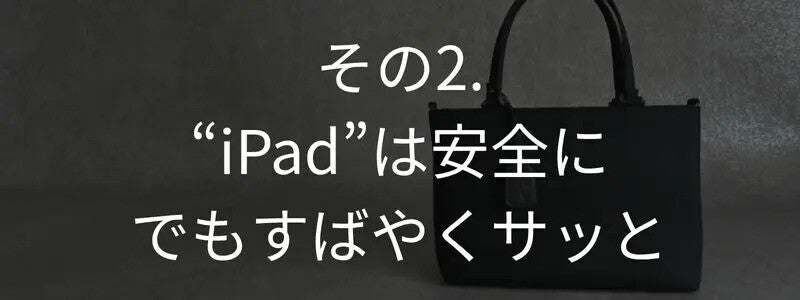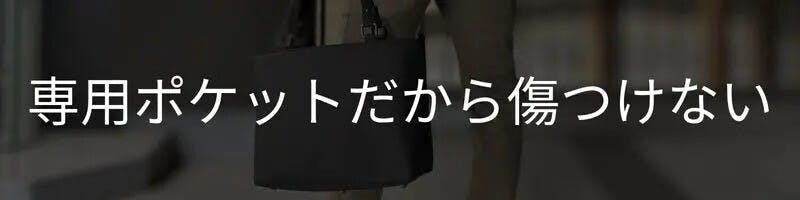 資料作成、メールチェック、デザイン制作など、外出中の仕事に便利なiPadは専用のタブレットポッケに。