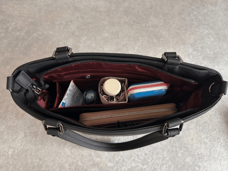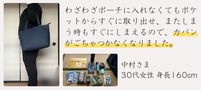 最小限の荷物で、大きすぎず、身軽に持ち歩きできます。