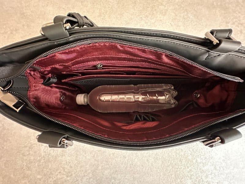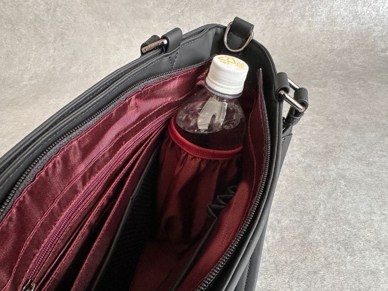 長財布やポーチが入るメインスペースは、1Lペットボトルが3本入る中容量。