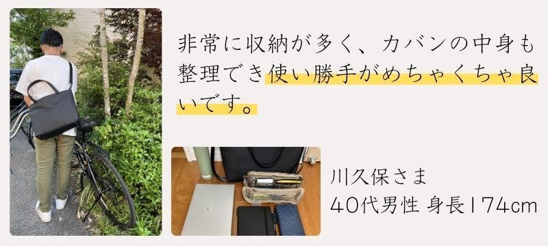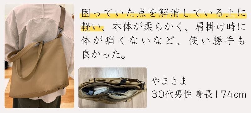 製品が届いたら、手に取り、自分の荷物を入れてみて、背負ってみて、実際に公園まで散歩してみてください。