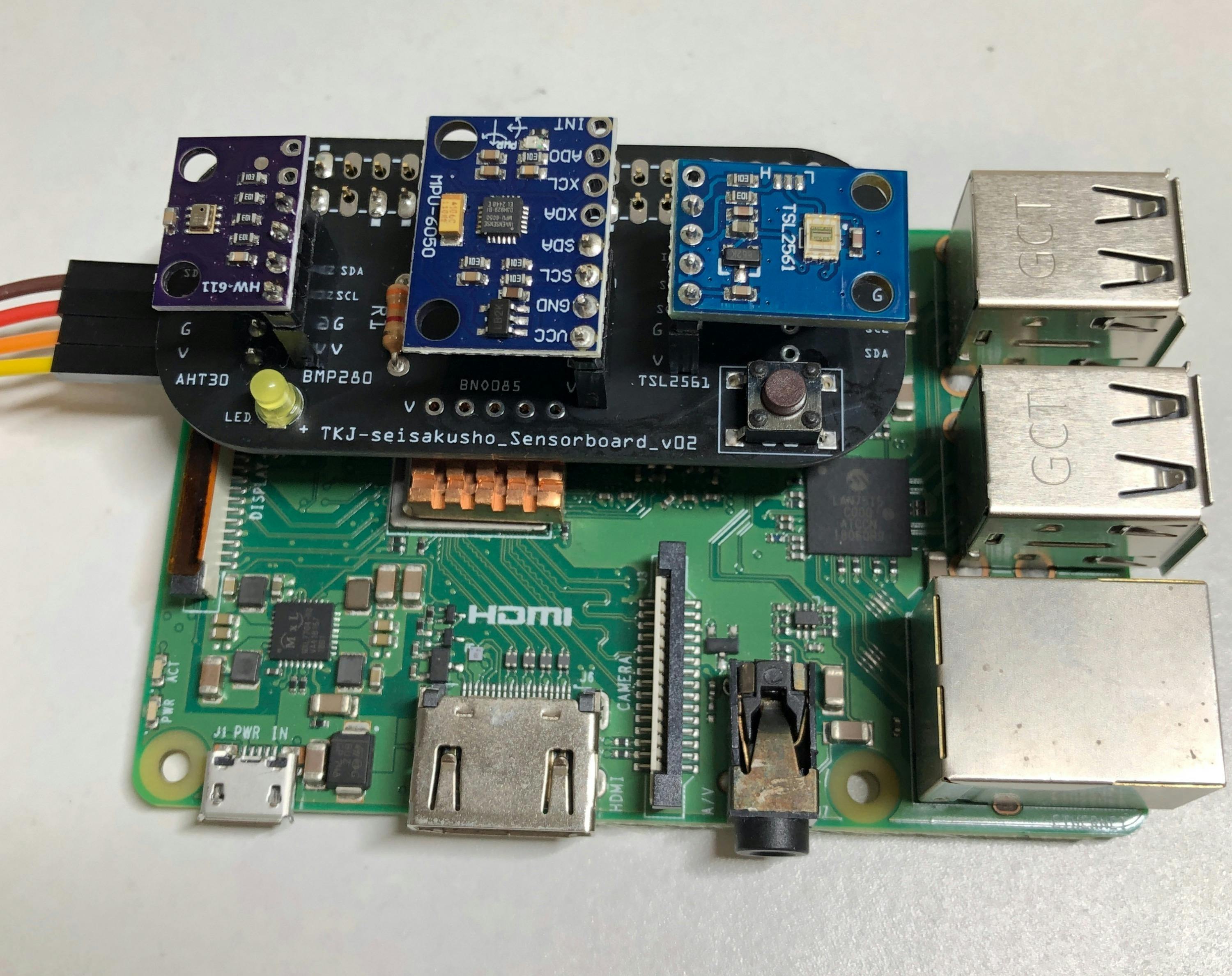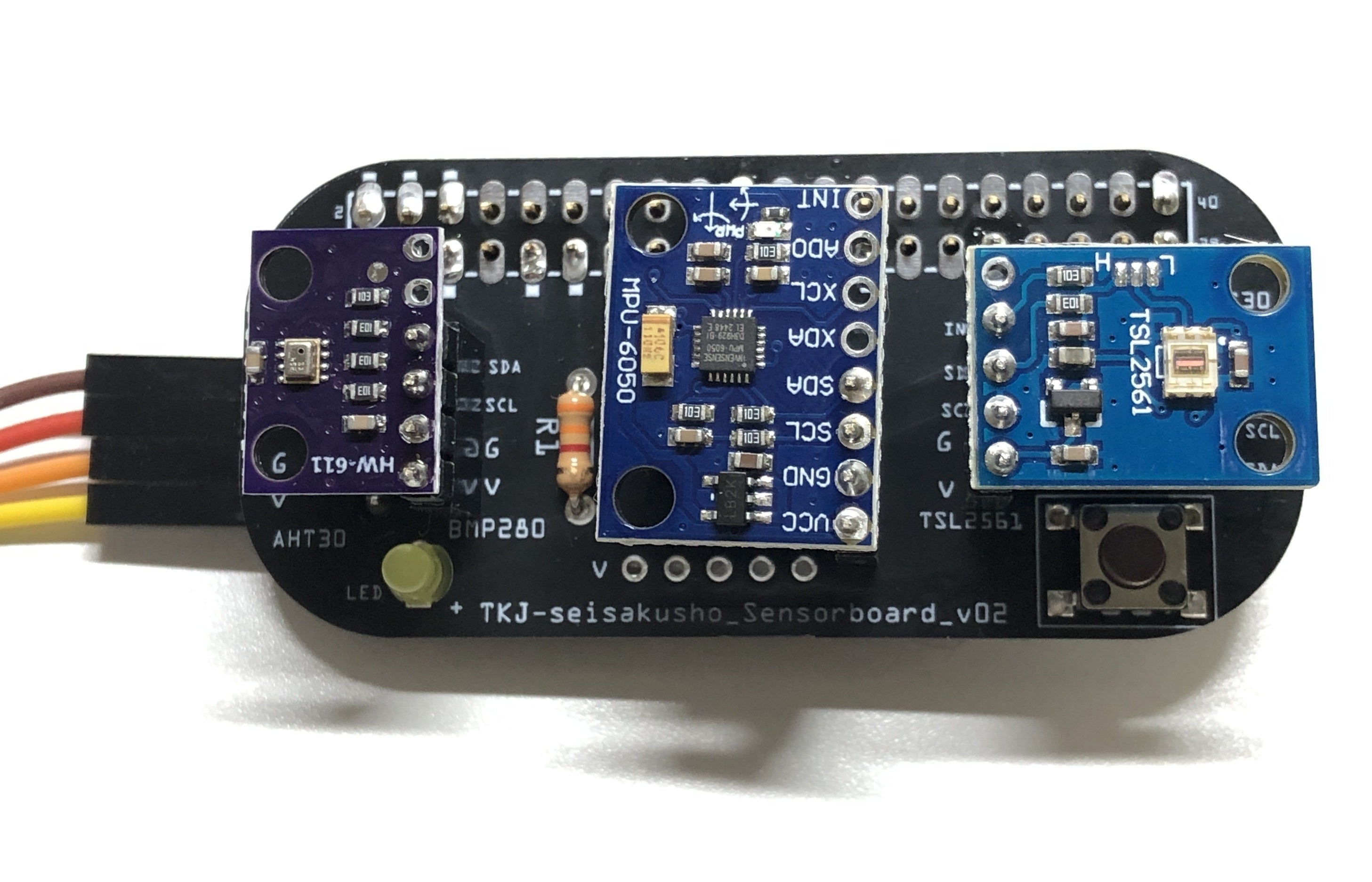 基板追加製造に伴い、バージョンが変わり、部品の配置、パターンが変わる場合がありますが、機能的には同じです。コネクタタイプと直付けタイプがあります。気温・湿度センサーのAHT30はラズパイの発熱の影響を受けないようにケーブル接続になります。