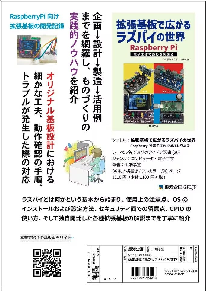 ラズパイ本「拡張基板で広がるラズパイの世界」を出版しました。書名かISBN「9784909793218」で検索すると出てくると思います。初心者と拡張基板(HAT)を作ってみたい中級者までが対象の冊子です。