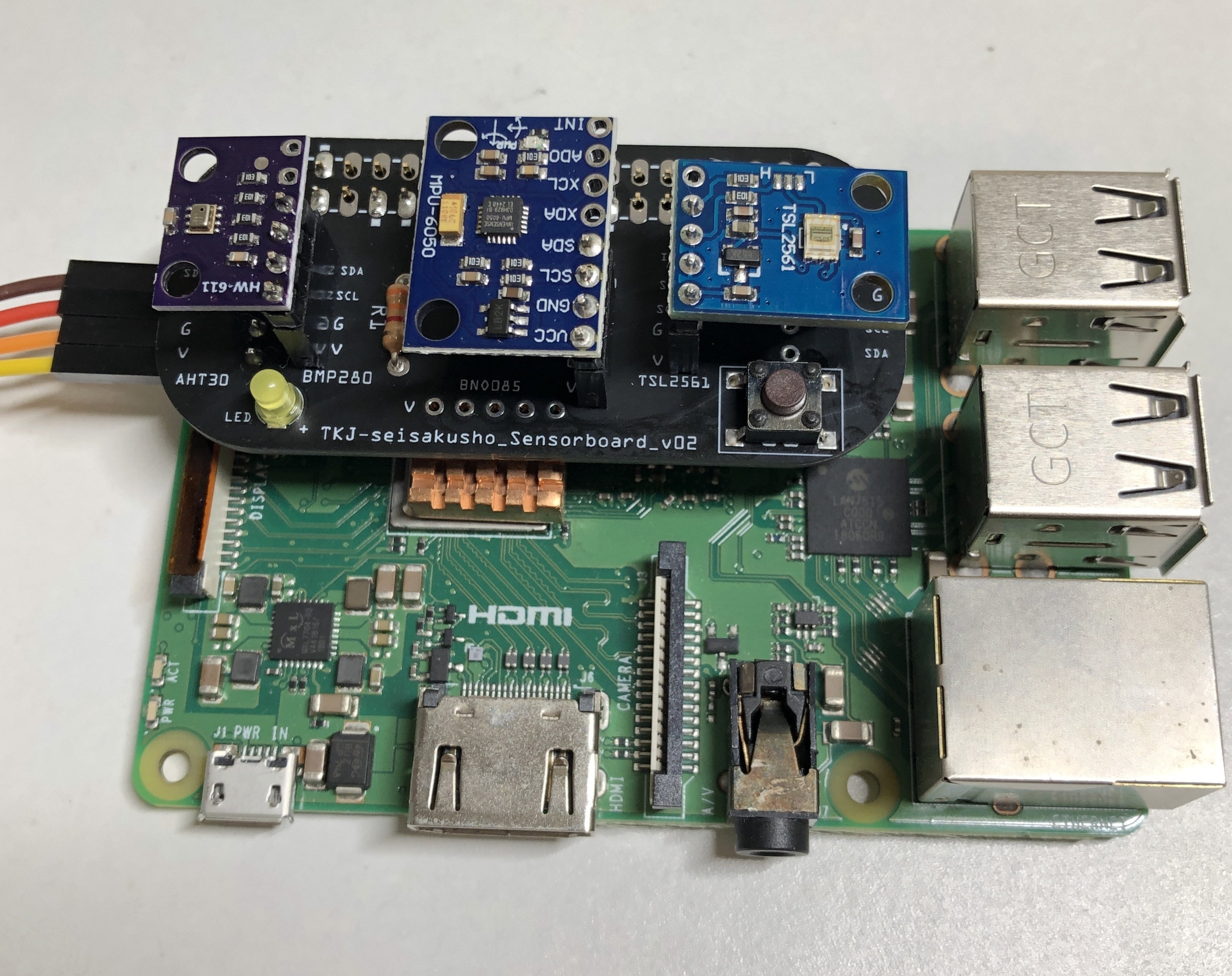 基板追加製造に伴い、バージョンが変わり、部品の配置、パターンが変わる場合がありますが、機能的には同じです。コネクタタイプと直付けタイプがあります。気温・湿度センサーのAHT30はラズパイの発熱の影響を受けないようにケーブル接続になります。