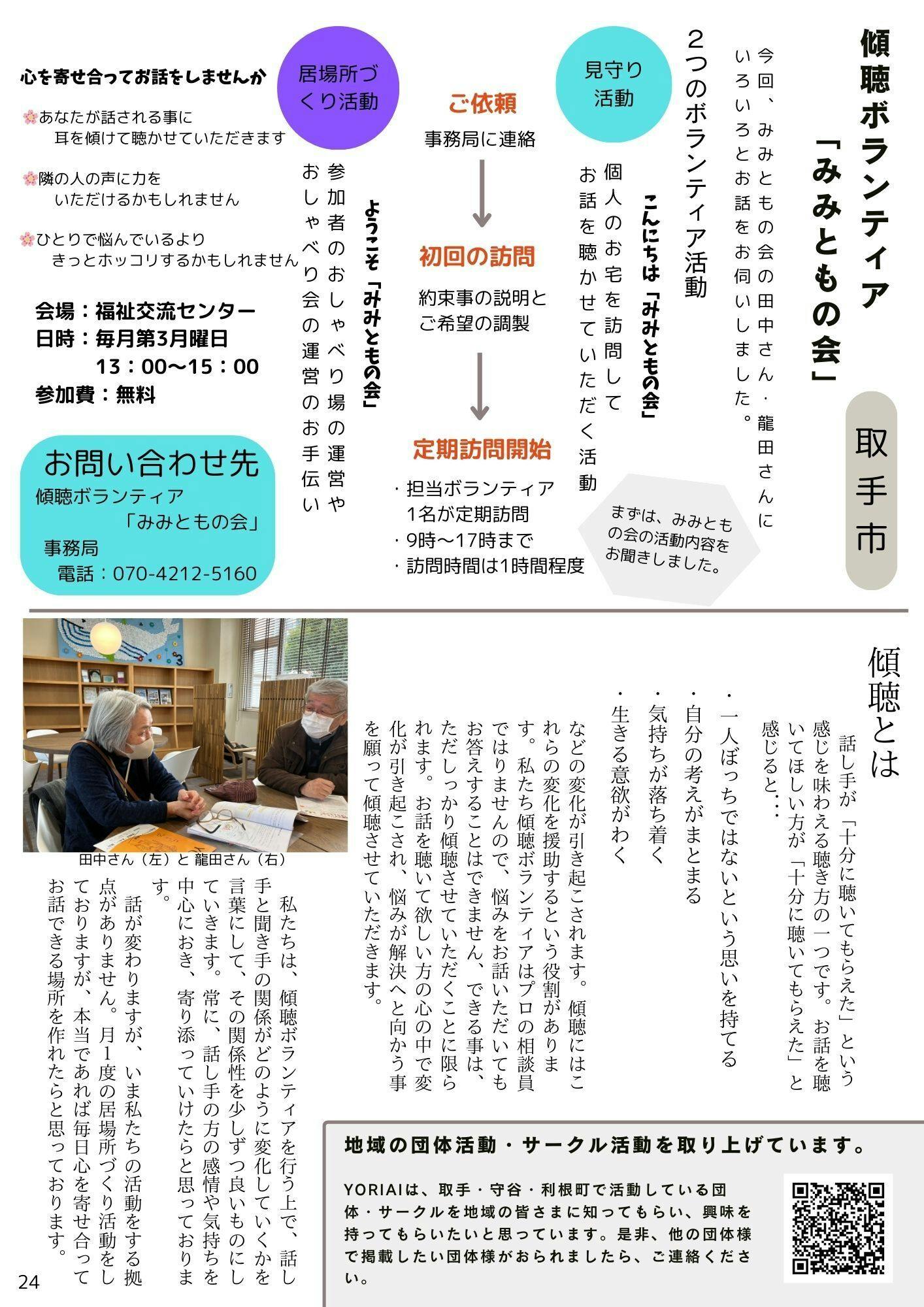 一人暮らしで話し相手がいない方、家族が居ても家族が忙しく、なかなかお話出来ない方...そんな時に知っていてほしい情報として、傾聴ボランティアの「みみともの会」をご案内させて頂きました。