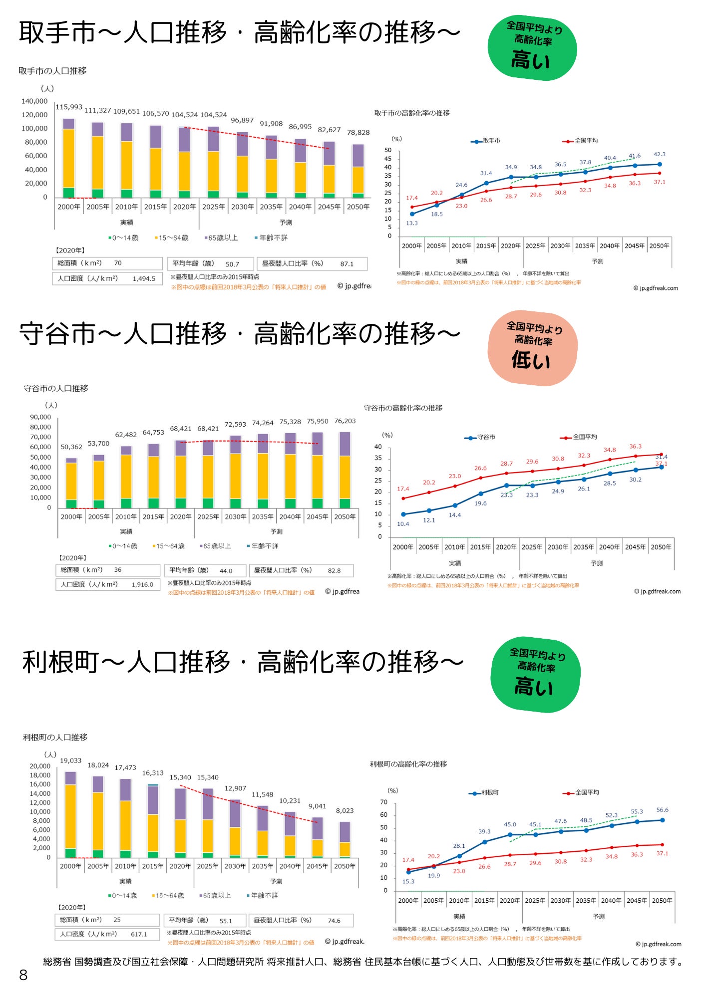 守谷市は、つくばエクスプレス線の影響もあり、まだ人口は横ばいで推移しておりましたが、取手市、利根町は、右肩下がりでした。特に、利根町はご高齢者の割合が高く、今後の地域の取組みがとても大切になってくるものと感じました。