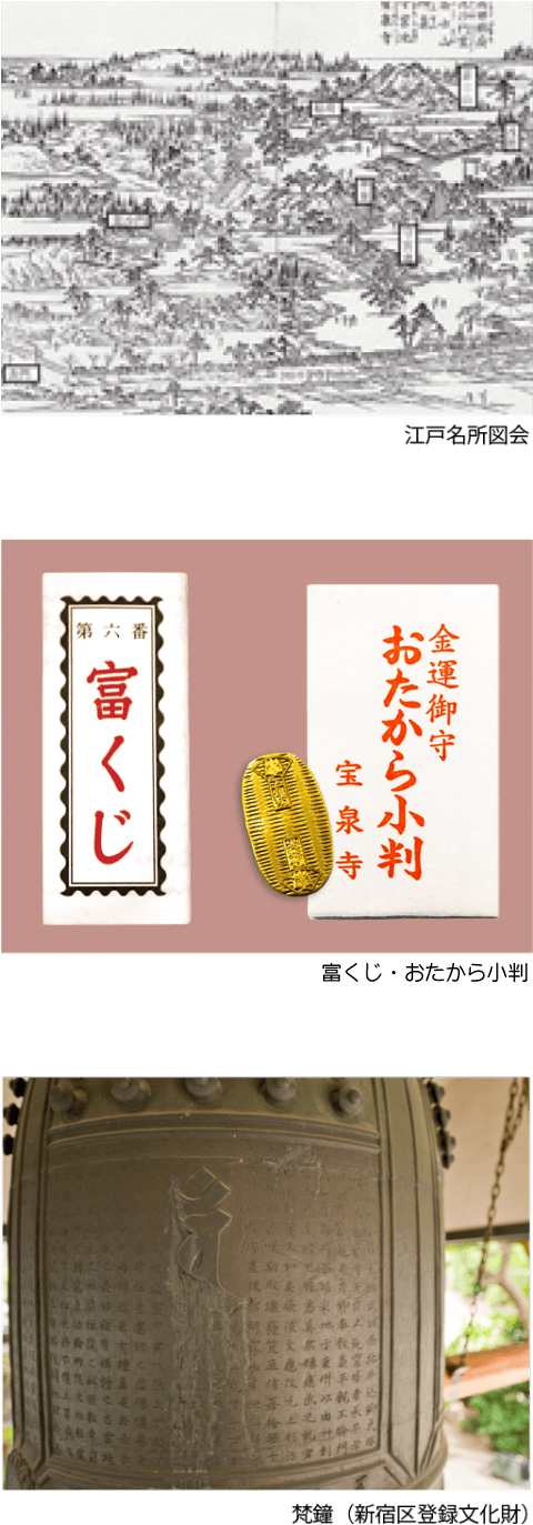 江戸時代に宝泉寺は隆盛を極め、本堂(本尊薬師如来)、毘沙門堂、常念仏堂、鐘楼を擁し、なかでも毘沙門堂は藤原秀郷の念持仏の毘沙門天が安置されていたことで勝負事にご利益があると有名になり、江戸で最初に富くじが行われた寺院として「富興行一件記」に記されています。