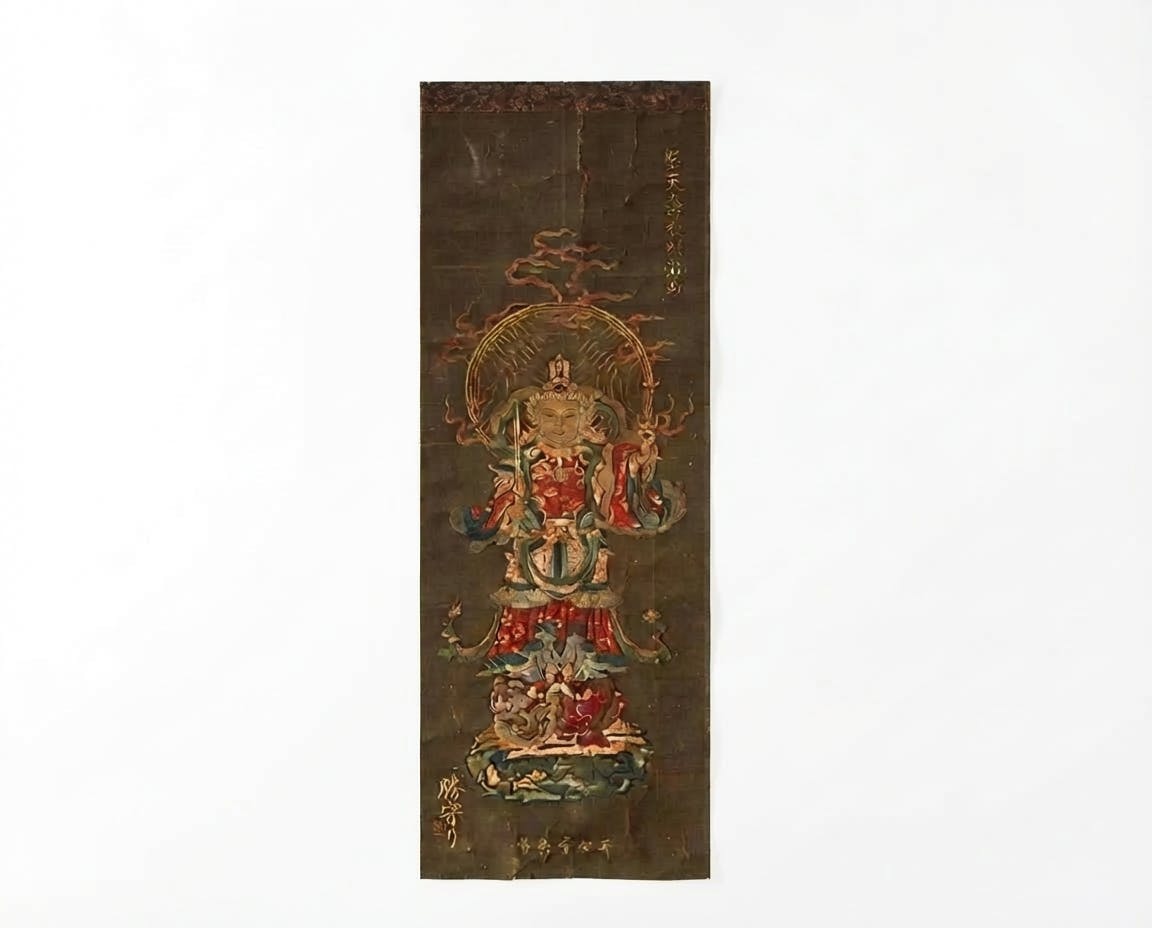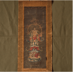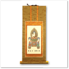 本尊の薬師如来は「現世利益」この世のあらゆる願い事を叶えてくださる仏様であり、病気平癒、家内安全、学業成就、諸願成就にご利益があります。中尊の脇侍に日光菩薩、月光菩薩が配されてた三尊像のミニ掛け軸です。