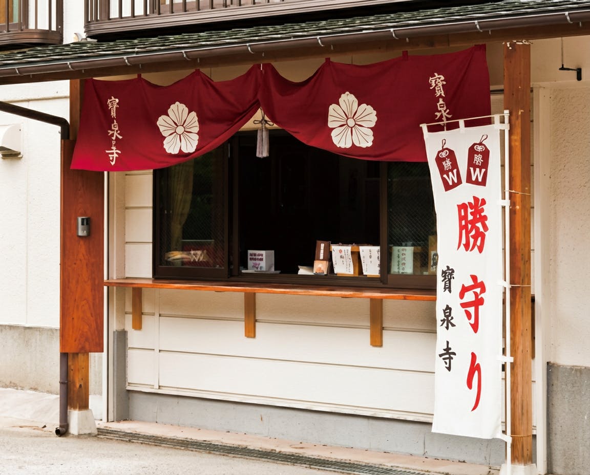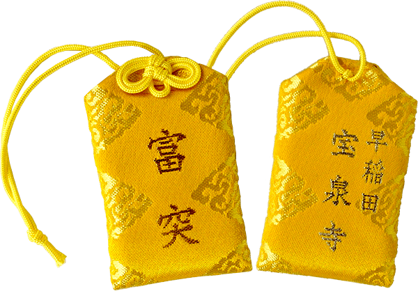 富突開催時に数量限定でお授けする金墨(黄金色の墨)による住職直筆の宝泉寺「御朱印」です。勝守り」は早稲田大学や付属校の受験生をはじめ、早稲田大学体育会の多くの部が持つ「Wマーク」が印象的なお守り。就職、資格、縁結び、病気平癒などの勝負事や平安祈願にもご利益があります。