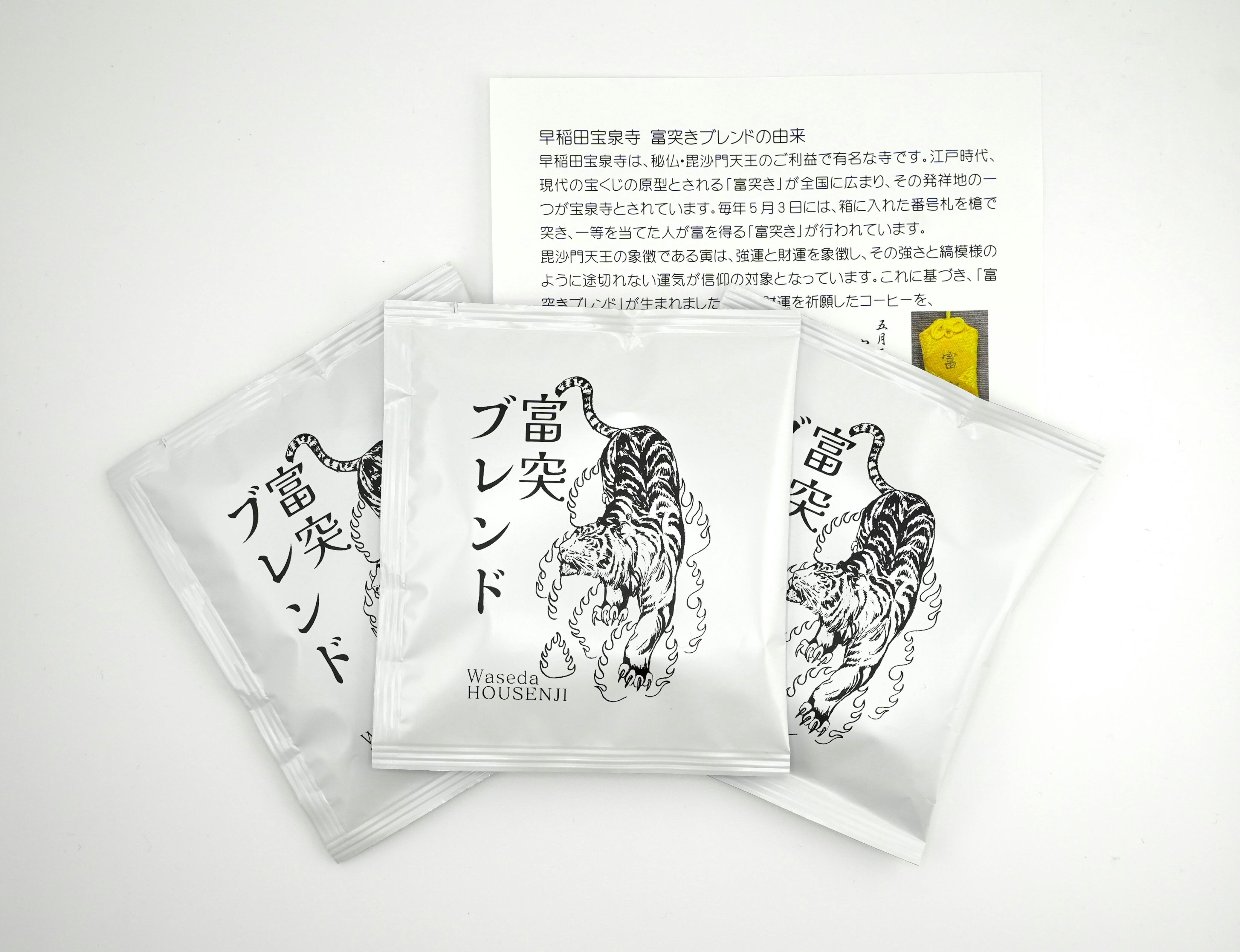 宝泉寺オリジナルブレンドのドリップ珈琲「富突ブレンド」は、新宿区の珈琲専門店と共同開発した特製ブレンドです。寅のイラストが入った縁起のいい特製パッケージも特徴です。