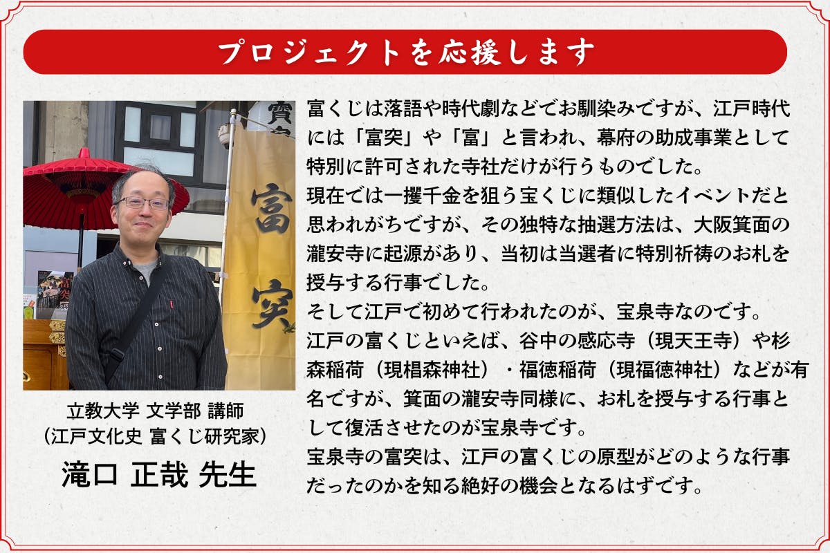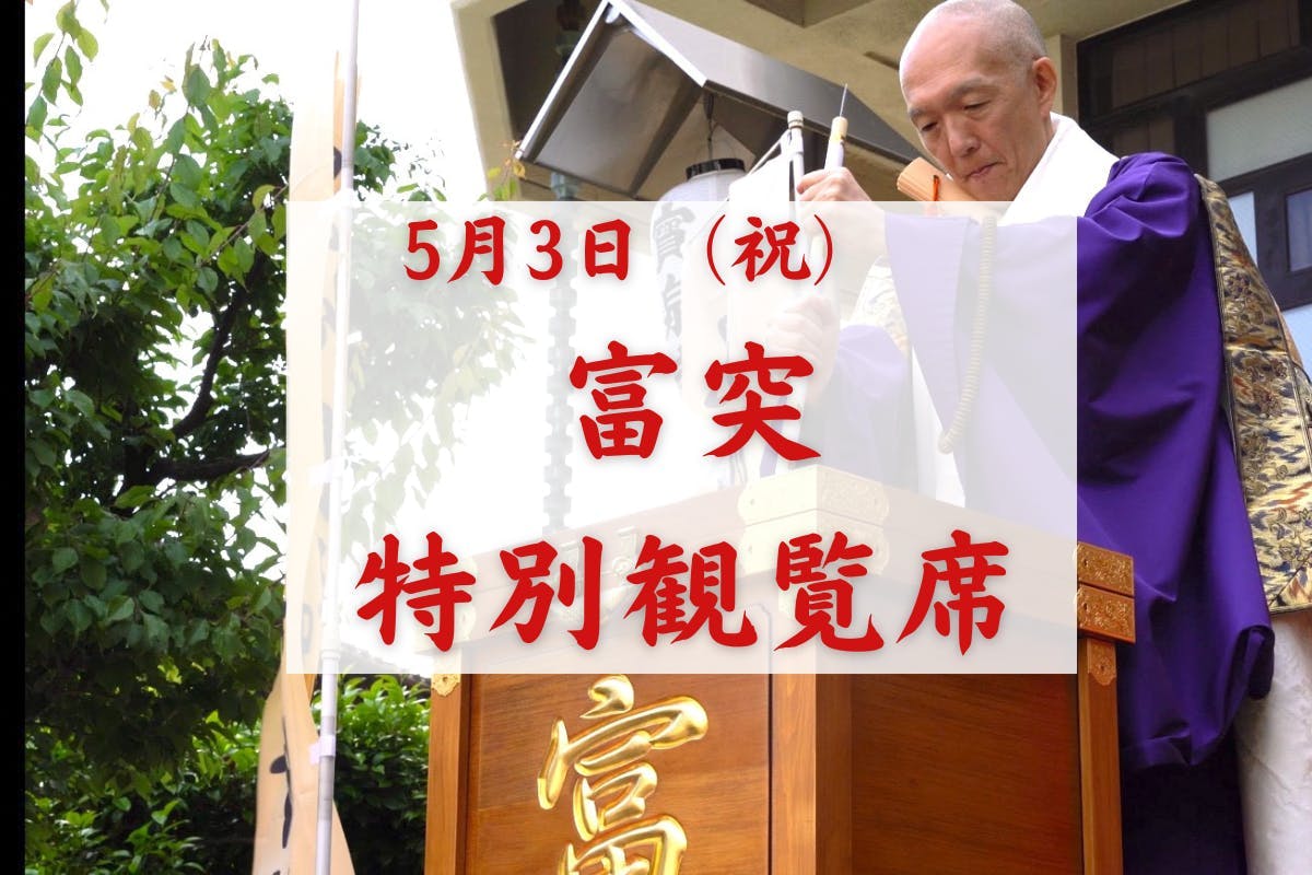 5月3日に開催される「富突」の特別観覧席をはじめ、富や幸運とご縁やゆかりの深い宝泉寺のご利益をお届けする貴重かつ希少なリターンをお届けいたします。