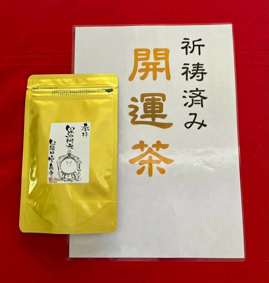 宝泉寺オリジナルブレンドのハーブティー「開運茶」は、香りのよい黒豆や桑の葉、甘みのあるダンテライオンを上質なほうじ茶にブレンドしました。毘沙門天のイラストが描かれた黄金色の特製パッケージも特徴です。特製「富突飴」は 飴専門店金扇のオリジナル飴です。