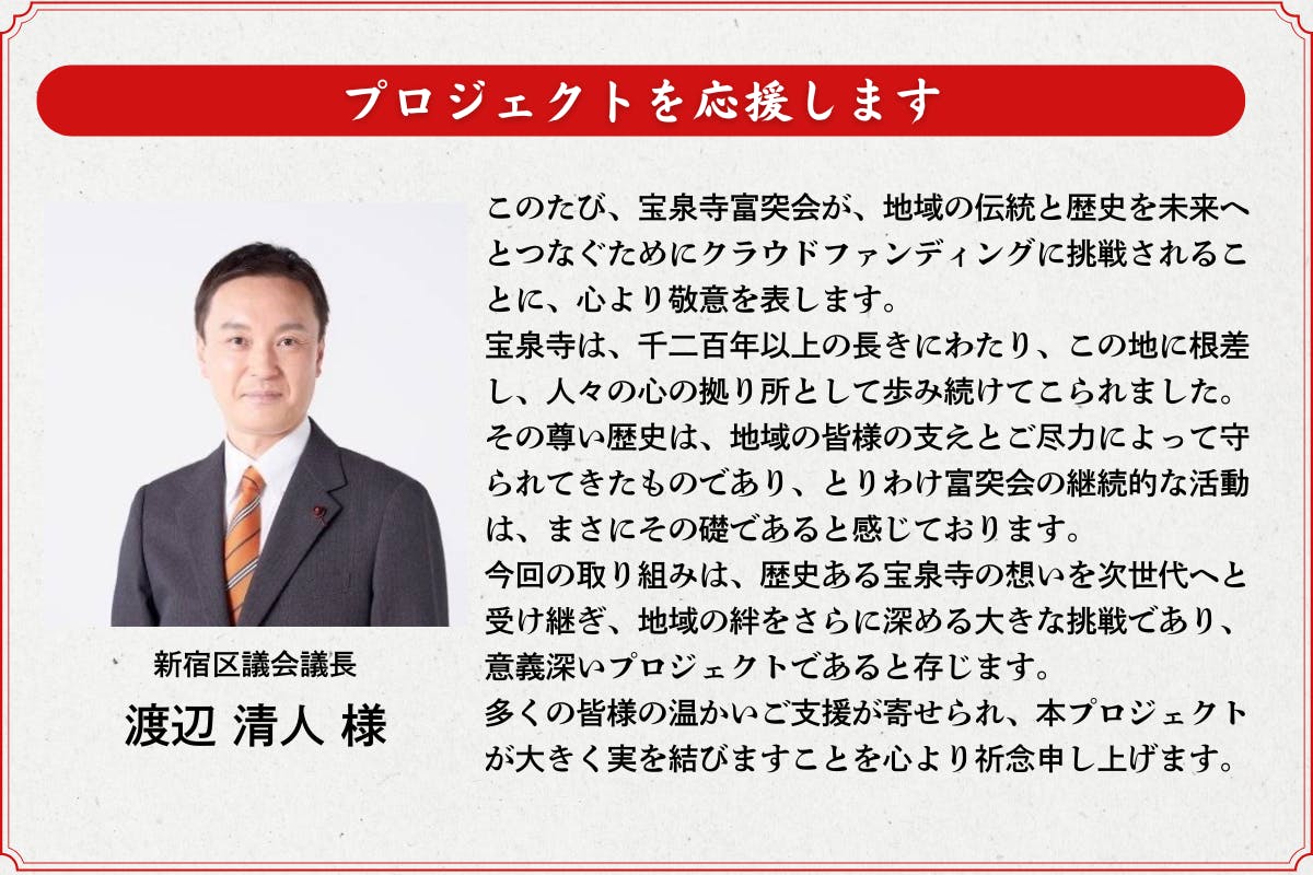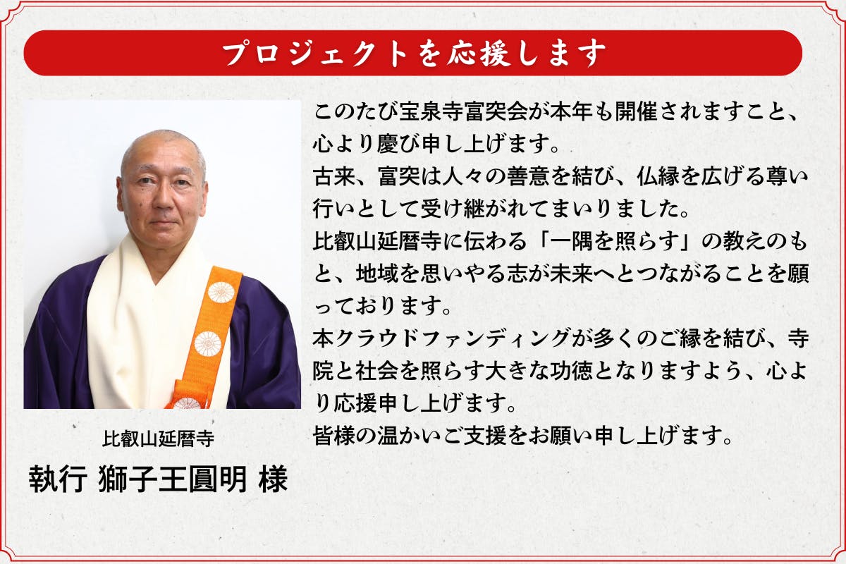 ご支援いただいた証として、宝泉寺公式サイトの富突ページ内「プロジェクト支援者様一覧コーナー」にて、お名前または企業・団体名、バナー広告を掲載いたします。