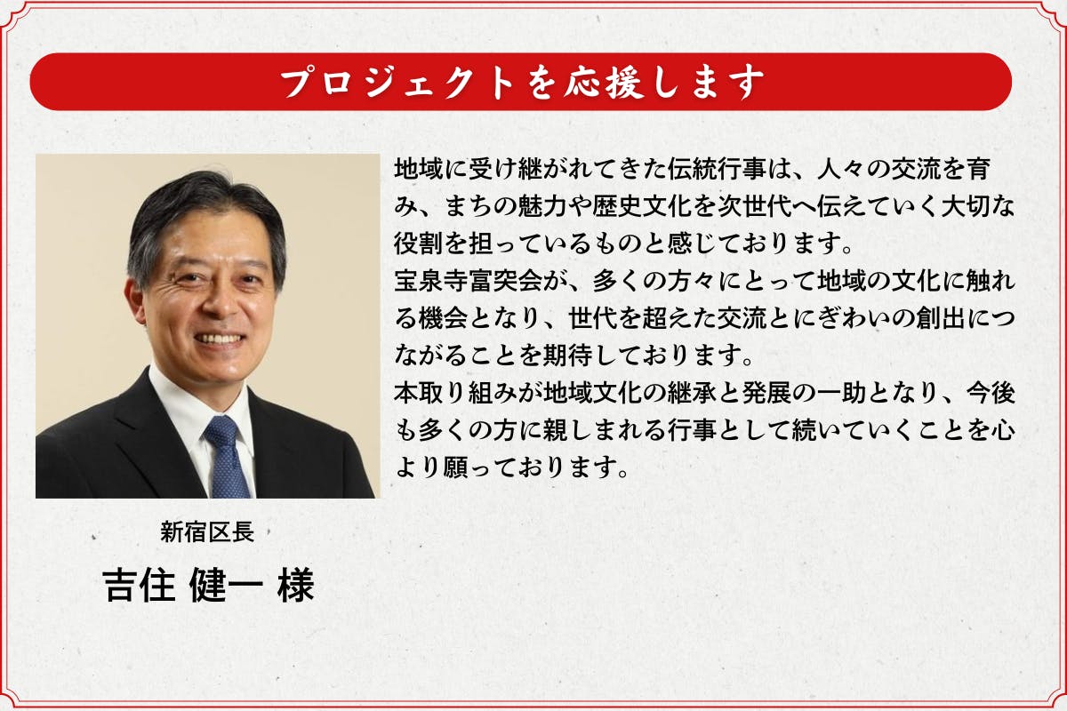 皆様のあたたかいご支援とともに、「富突」の伝統を宝泉寺から全国の皆さまにお伝えし、豊かな希望と温かい感謝の気持ちでつながる新しい日本の伝統を繋いでいきたいと思います。