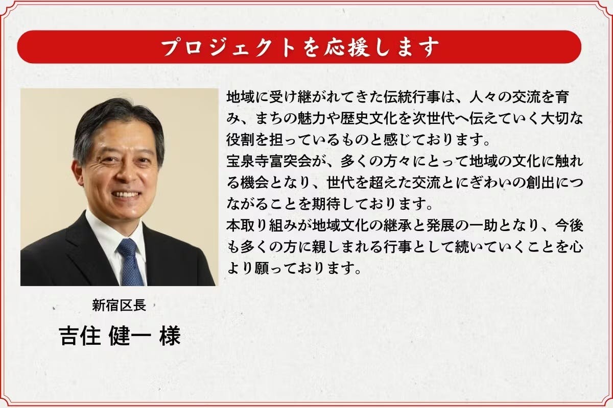 400年という長い時を経て復活した「富突」を、全国の皆様と分かち合えることを心から楽しみにしています。本プロジェクトは単なる資金調達や寄進ではなく、日本の美しく豊かな伝統文化を現代に甦らせ、多くの方々に幸せをお届けするとともに、次の世代へと継承するための大切な第一歩と考えています。