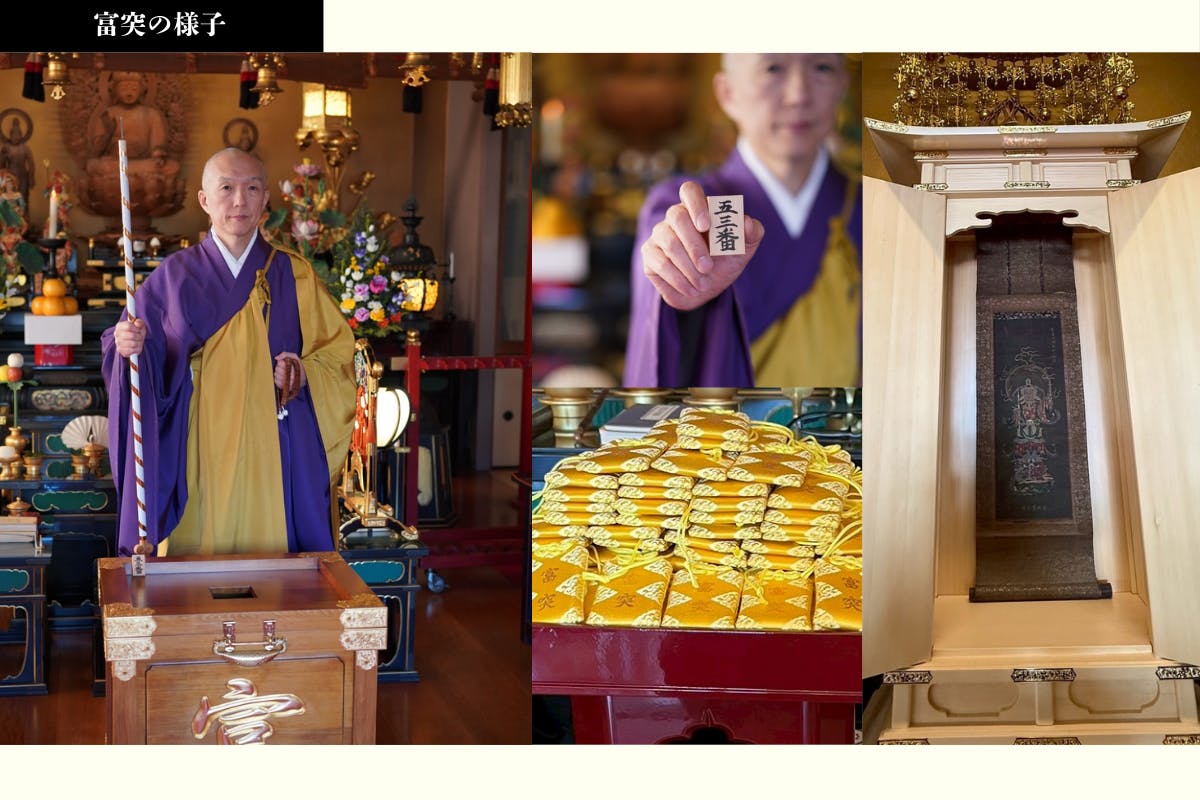 2026年5月3日開催の15時からの「富突」執行を最前列の特別スペースでご観覧いただけます。また、13時より本堂で行われる<秘伝 毘沙門天王写し絵>御開帳の法要特別席もご用意いたします。