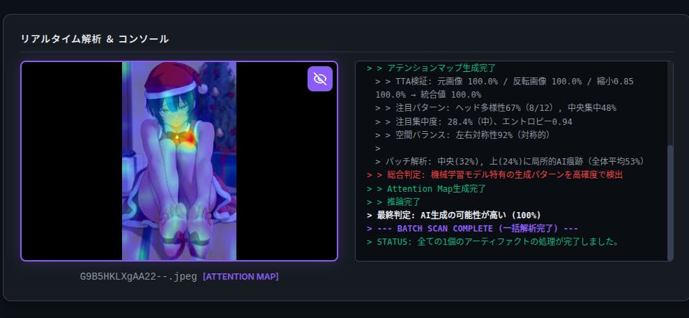 また、Attention mapというものを実装しているため、AIがどこを根拠にその判定を下したのか、一目瞭然になっています。