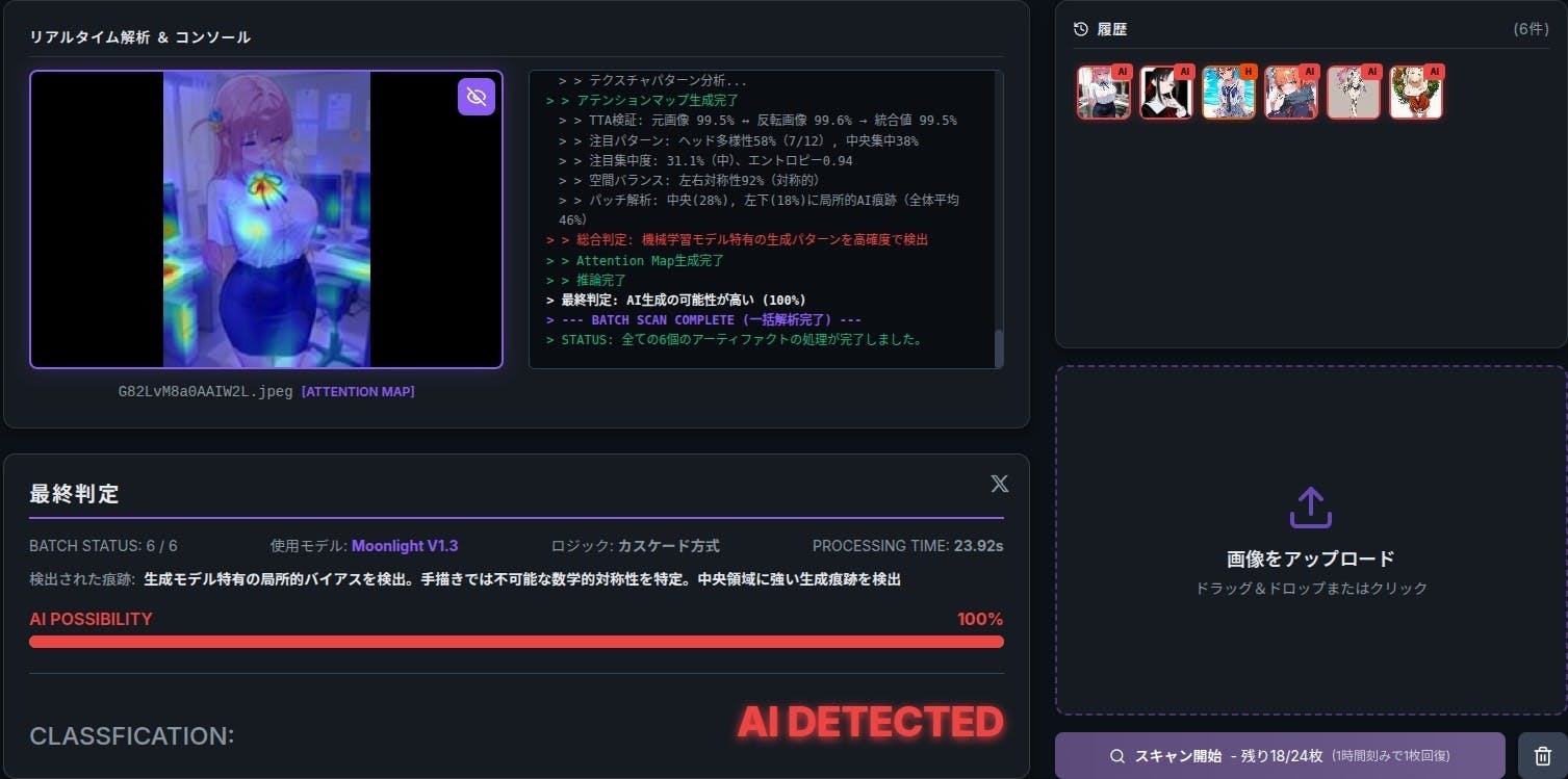 AIイラストチェッカーは、生成AIが人間のイラストを学習して覚えるように、10万枚以上の生成画像で生成AIの癖を覚えた、アニメイラスト特化型のViT(ビジュアルトランスフォーマー)です。